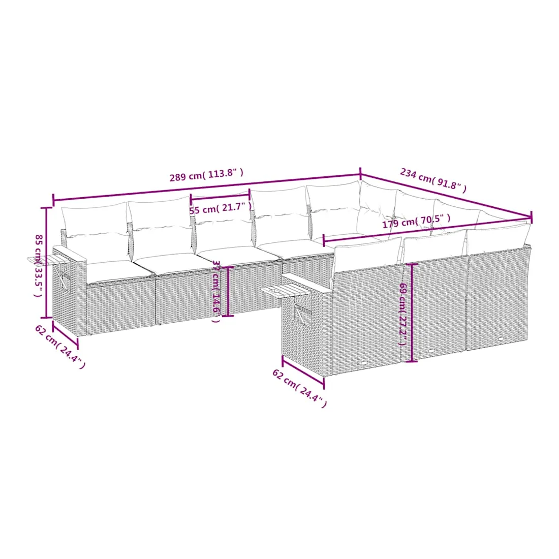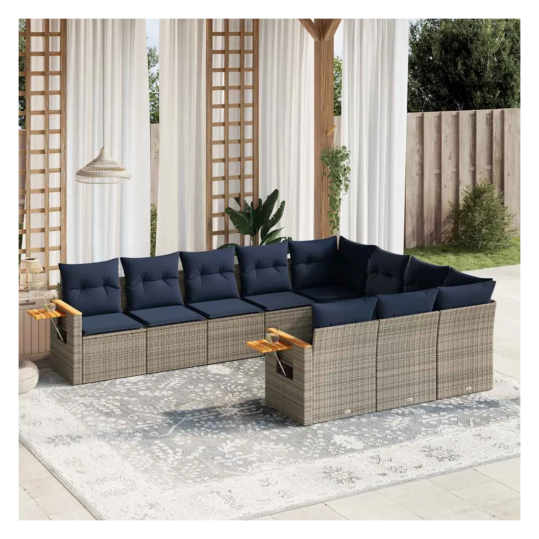 Cet ensemble de canapés de jardin est le complément parfait de votre arrière-cour, terrasse ou patio, offrant un espace confortable et accueillant pour discuter avec la famille et les amis ou simplement se détendre et profiter de l'extérieur. Matériau durable : la résine tressée, également connue sous le nom de poly rotin, est un matériau synthétique solide et nécessitant peu d'entretien qui ressemble au rotin naturel. Il est léger, facile à nettoyer et couramment utilisé pour les meubles d'extérieur en raison de sa durabilité et de ses propriétés de résistance aux intempéries.Table d'appoint pratique : ce mobilier d'extérieur comprend une table d'appoint pliable avec un ressort à gaz sur les accoudoirs, offrant un endroit pratique pour garder vos essentiels à portée de main.Housse amovible et lavable : ces coussins de siège sont dotés de housses amovibles pour un lavage et un entretien faciles.Conception modulaire : cet ensemble de meubles d'extérieur a une conception modulaire, ce qui le rend complètement flexible et facile à déplacer, afin que vous puissiez créer un agencement de meubles d'extérieur personnalisé. Bon à savoir :Pour que vos meubles d'extérieur restent beaux, nous vous recommandons de les protéger avec une housse imperméable.