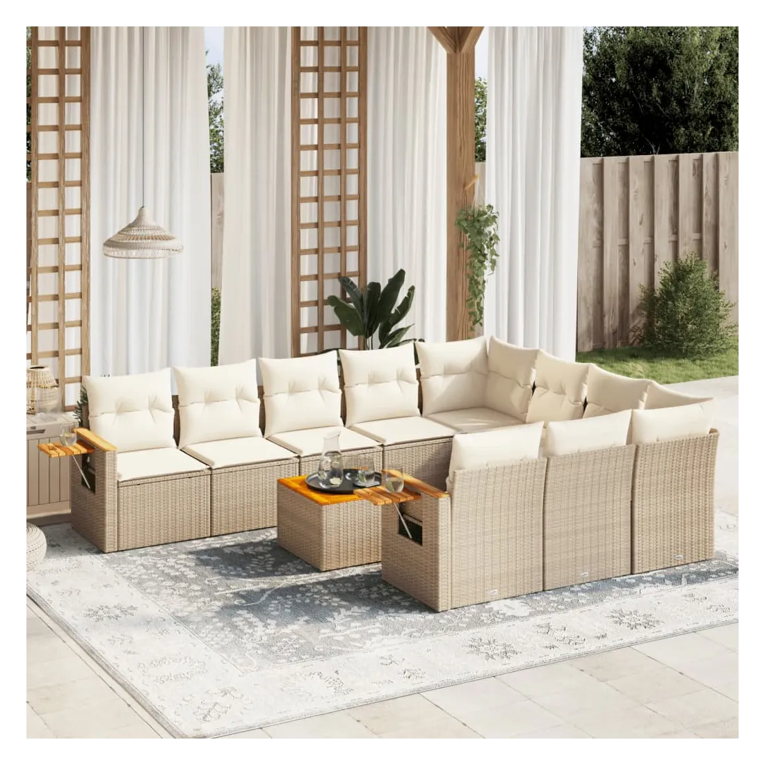 Cet ensemble de canapés de jardin est le complément parfait de votre arrière-cour, terrasse ou patio, offrant un espace confortable et accueillant pour discuter avec la famille et les amis ou simplement se détendre et profiter de l'extérieur. Matériau durable : la résine tressée, également connue sous le nom de poly rotin, est un matériau synthétique solide et nécessitant peu d'entretien qui ressemble au rotin naturel. Il est léger, facile à nettoyer et couramment utilisé pour les meubles d'extérieur en raison de sa durabilité et de ses propriétés de résistance aux intempéries.Dessus stable et facile à nettoyer : cette table de jardin a un dessus en bois d'acacia robuste, durable et facile à nettoyer avec un chiffon humide.Table d'appoint pratique : ce mobilier d'extérieur comprend une table d'appoint pliable avec un ressort à gaz sur les accoudoirs, offrant un endroit pratique pour garder vos essentiels à portée de main.Housse amovible et lavable : ces coussins de siège sont dotés de housses amovibles pour un lavage et un entretien faciles.Conception modulaire : cet ensemble de meubles d'extérieur a une conception modulaire, ce qui le rend complètement flexible et facile à déplacer, afin que vous puissiez créer un agencement de meubles d'extérieur personnalisé. Bon à savoir :Pour que vos meubles d'extérieur restent beaux, nous vous recommandons de les protéger avec une housse imperméable.