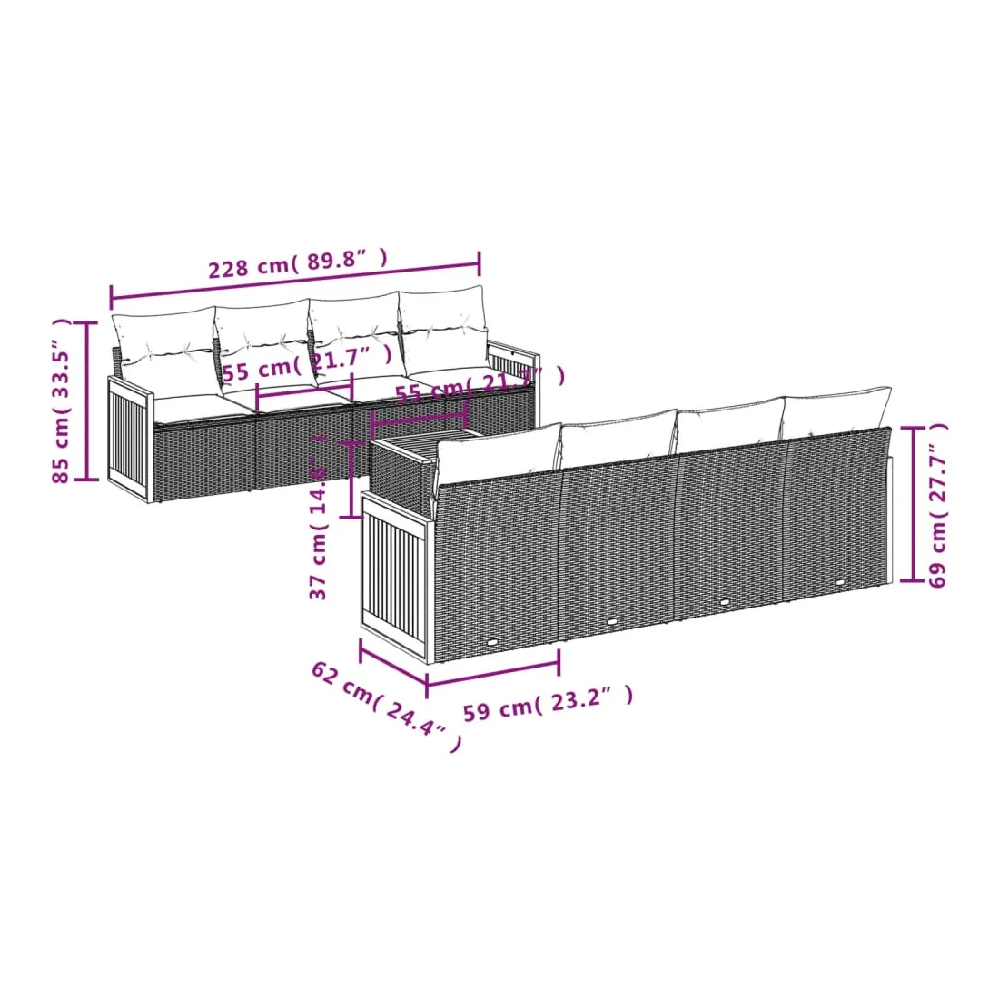 Cet ensemble de canapés de jardin est le complément parfait de votre arrière-cour, terrasse ou patio, offrant un espace confortable et accueillant pour discuter avec la famille et les amis ou simplement se détendre et profiter de l'extérieur. Matériau durable : la résine tressée, également connue sous le nom de poly rotin, est un matériau synthétique solide et nécessitant peu d'entretien qui ressemble au rotin naturel. Il est léger, facile à nettoyer et couramment utilisé pour les meubles d'extérieur en raison de sa durabilité et de ses propriétés de résistance aux intempéries.Expérience d'assise confortable : ce mobilier d'extérieur, doté de coussins épais, offre une expérience d'assise confortable.Dessus stable et facile à nettoyer : cette table de jardin a un dessus en bois d'acacia robuste, durable et facile à nettoyer avec un chiffon humide.Housse amovible et lavable : ces coussins de siège sont dotés de housses amovibles pour un lavage et un entretien faciles.Conception modulaire : cet ensemble de meubles d'extérieur a une conception modulaire, ce qui le rend complètement flexible et facile à déplacer, afin que vous puissiez créer un agencement de meubles d'extérieur personnalisé. Bon à savoir :Pour que vos meubles d'extérieur restent beaux, nous vous recommandons de les protéger avec une housse imperméable.