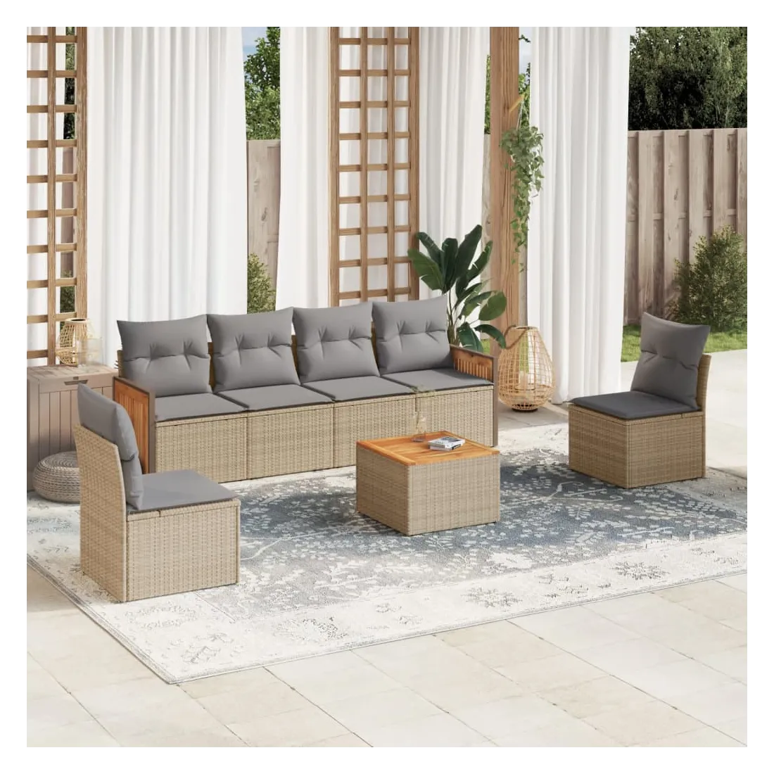 Cet ensemble de canapés de jardin est le complément parfait de votre arrière-cour, terrasse ou patio, offrant un espace confortable et accueillant pour discuter avec la famille et les amis ou simplement se détendre et profiter de l'extérieur. Matériau durable : la résine tressée, également connue sous le nom de poly rotin, est un matériau synthétique solide et nécessitant peu d'entretien qui ressemble au rotin naturel. Il est léger, facile à nettoyer et couramment utilisé pour les meubles d'extérieur en raison de sa durabilité et de ses propriétés de résistance aux intempéries.Expérience d'assise confortable : ce mobilier d'extérieur, doté de coussins épais, offre une expérience d'assise confortable.Dessus stable et facile à nettoyer : cette table de jardin a un dessus en bois d'acacia robuste, durable et facile à nettoyer avec un chiffon humide.Housse amovible et lavable : ces coussins de siège sont dotés de housses amovibles pour un lavage et un entretien faciles.Conception modulaire : cet ensemble de meubles d'extérieur a une conception modulaire, ce qui le rend complètement flexible et facile à déplacer, afin que vous puissiez créer un agencement de meubles d'extérieur personnalisé. Bon à savoir :Pour que vos meubles d'extérieur restent beaux, nous vous recommandons de les protéger avec une housse imperméable.