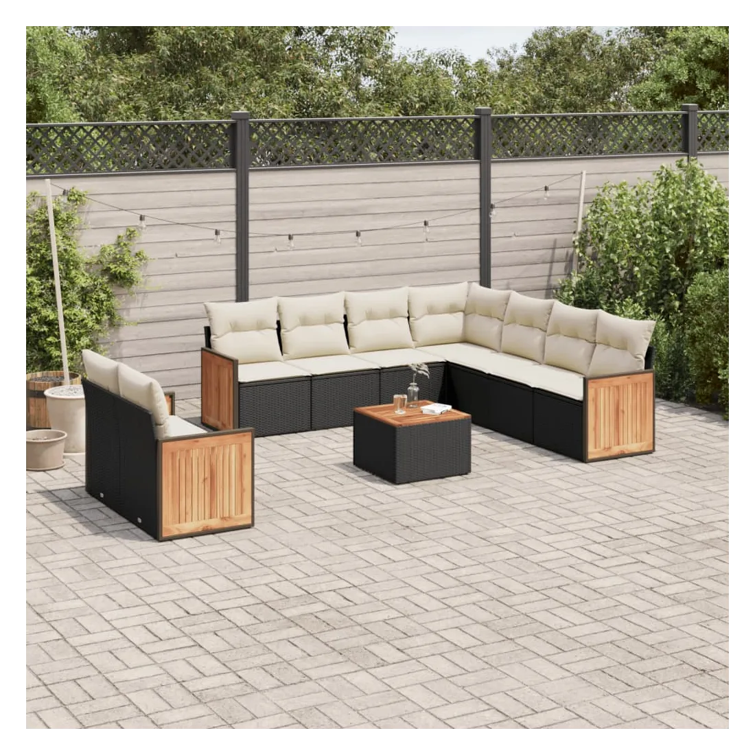 Cet ensemble de canapés de jardin est le complément parfait de votre arrière-cour, terrasse ou patio, offrant un espace confortable et accueillant pour discuter avec la famille et les amis ou simplement se détendre et profiter de l'extérieur. Matériau durable : la résine tressée, également connue sous le nom de poly rotin, est un matériau synthétique solide et nécessitant peu d'entretien qui ressemble au rotin naturel. Il est léger, facile à nettoyer et couramment utilisé pour les meubles d'extérieur en raison de sa durabilité et de ses propriétés de résistance aux intempéries.Expérience d'assise confortable : ce mobilier d'extérieur, doté de coussins épais, offre une expérience d'assise confortable.Dessus stable et facile à nettoyer : cette table de jardin a un dessus en bois d'acacia robuste, durable et facile à nettoyer avec un chiffon humide.Housse amovible et lavable : ces coussins de siège sont dotés de housses amovibles pour un lavage et un entretien faciles.Conception modulaire : cet ensemble de meubles d'extérieur a une conception modulaire, ce qui le rend complètement flexible et facile à déplacer, afin que vous puissiez créer un agencement de meubles d'extérieur personnalisé. Bon à savoir :Pour que vos meubles d'extérieur restent beaux, nous vous recommandons de les protéger avec une housse imperméable.