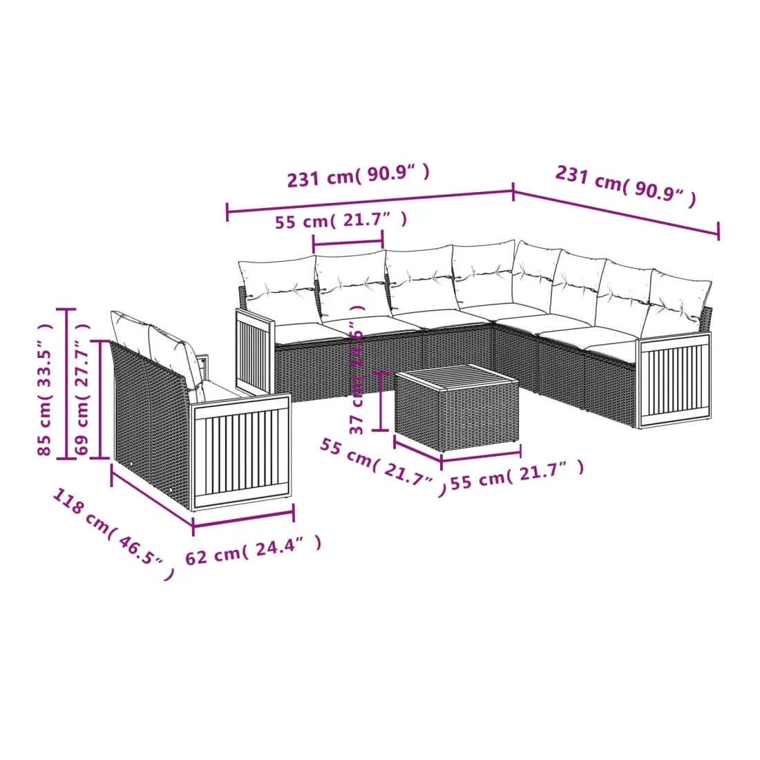 - 9 x coussin d'assise avec housse amovible et lavable