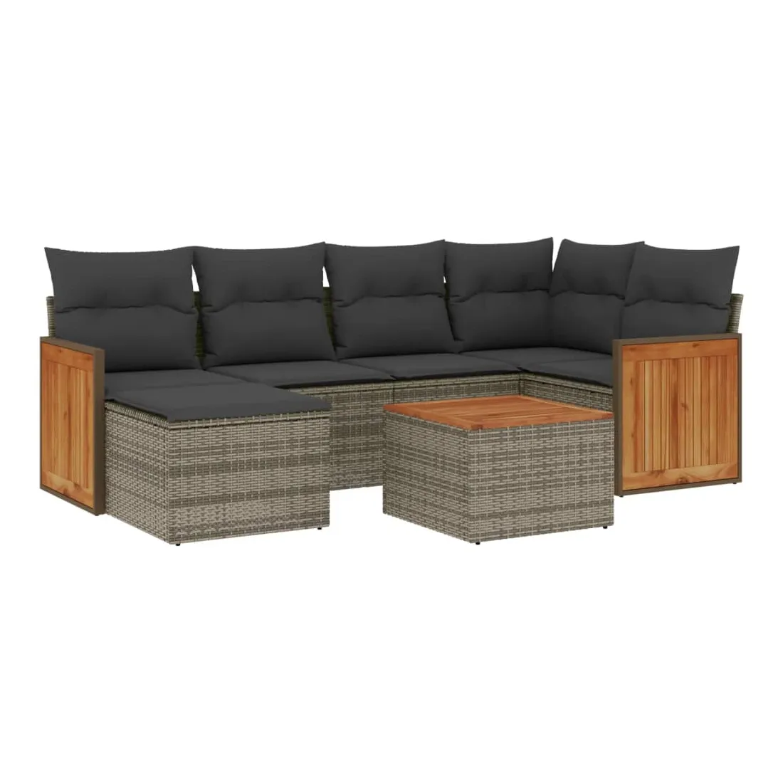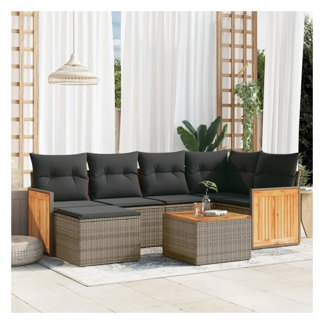 Cet ensemble de canapés de jardin est le complément parfait de votre arrière-cour, terrasse ou patio, offrant un espace confortable et accueillant pour discuter avec la famille et les amis ou simplement se détendre et profiter de l'extérieur. Matériau durable : la résine tressée, également connue sous le nom de poly rotin, est un matériau synthétique solide et nécessitant peu d'entretien qui ressemble au rotin naturel. Il est léger, facile à nettoyer et couramment utilisé pour les meubles d'extérieur en raison de sa durabilité et de ses propriétés de résistance aux intempéries.Expérience d'assise confortable : ce mobilier d'extérieur, doté de coussins épais, offre une expérience d'assise confortable.Dessus stable et facile à nettoyer : cette table de jardin a un dessus en bois d'acacia robuste, durable et facile à nettoyer avec un chiffon humide.Housse amovible et lavable : ces coussins de siège sont dotés de housses amovibles pour un lavage et un entretien faciles.Conception modulaire : cet ensemble de meubles d'extérieur a une conception modulaire, ce qui le rend complètement flexible et facile à déplacer, afin que vous puissiez créer un agencement de meubles d'extérieur personnalisé. Bon à savoir :Pour que vos meubles d'extérieur restent beaux, nous vous recommandons de les protéger avec une housse imperméable.
