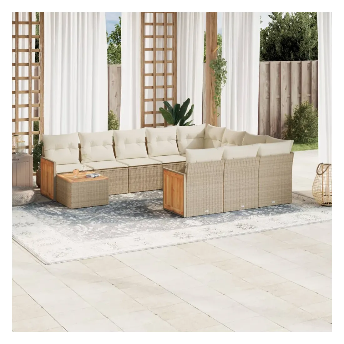 Cet ensemble de canapés de jardin est le complément parfait de votre arrière-cour, terrasse ou patio, offrant un espace confortable et accueillant pour discuter avec la famille et les amis ou simplement se détendre et profiter de l'extérieur. Matériau durable : la résine tressée, également connue sous le nom de poly rotin, est un matériau synthétique solide et nécessitant peu d'entretien qui ressemble au rotin naturel. Il est léger, facile à nettoyer et couramment utilisé pour les meubles d'extérieur en raison de sa durabilité et de ses propriétés de résistance aux intempéries.Expérience d'assise confortable : ce mobilier d'extérieur, doté de coussins épais, offre une expérience d'assise confortable.Dessus stable et facile à nettoyer : cette table de jardin a un dessus en bois d'acacia robuste, durable et facile à nettoyer avec un chiffon humide.Housse amovible et lavable : ces coussins de siège sont dotés de housses amovibles pour un lavage et un entretien faciles.Conception modulaire : cet ensemble de meubles d'extérieur a une conception modulaire, ce qui le rend complètement flexible et facile à déplacer, afin que vous puissiez créer un agencement de meubles d'extérieur personnalisé. Bon à savoir :Pour que vos meubles d'extérieur restent beaux, nous vous recommandons de les protéger avec une housse imperméable.