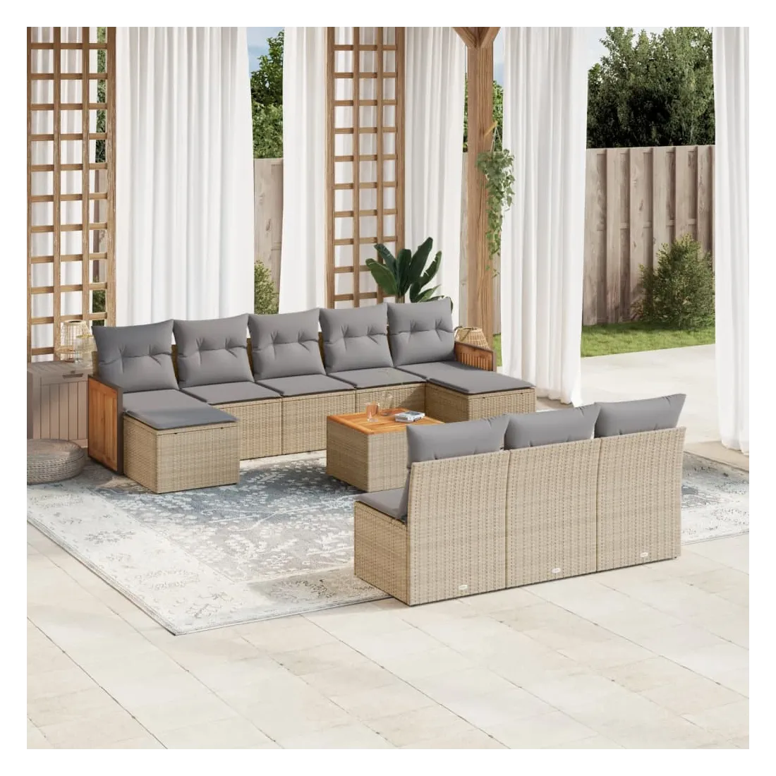 Cet ensemble de canapés de jardin est le complément parfait de votre arrière-cour, terrasse ou patio, offrant un espace confortable et accueillant pour discuter avec la famille et les amis ou simplement se détendre et profiter de l'extérieur. Matériau durable : la résine tressée, également connue sous le nom de poly rotin, est un matériau synthétique solide et nécessitant peu d'entretien qui ressemble au rotin naturel. Il est léger, facile à nettoyer et couramment utilisé pour les meubles d'extérieur en raison de sa durabilité et de ses propriétés de résistance aux intempéries.Expérience d'assise confortable : ce mobilier d'extérieur, doté de coussins épais, offre une expérience d'assise confortable.Dessus stable et facile à nettoyer : cette table de jardin a un dessus en bois d'acacia robuste, durable et facile à nettoyer avec un chiffon humide.Housse amovible et lavable : ces coussins de siège sont dotés de housses amovibles pour un lavage et un entretien faciles.Conception modulaire : cet ensemble de meubles d'extérieur a une conception modulaire, ce qui le rend complètement flexible et facile à déplacer, afin que vous puissiez créer un agencement de meubles d'extérieur personnalisé. Bon à savoir :Pour que vos meubles d'extérieur restent beaux, nous vous recommandons de les protéger avec une housse imperméable.