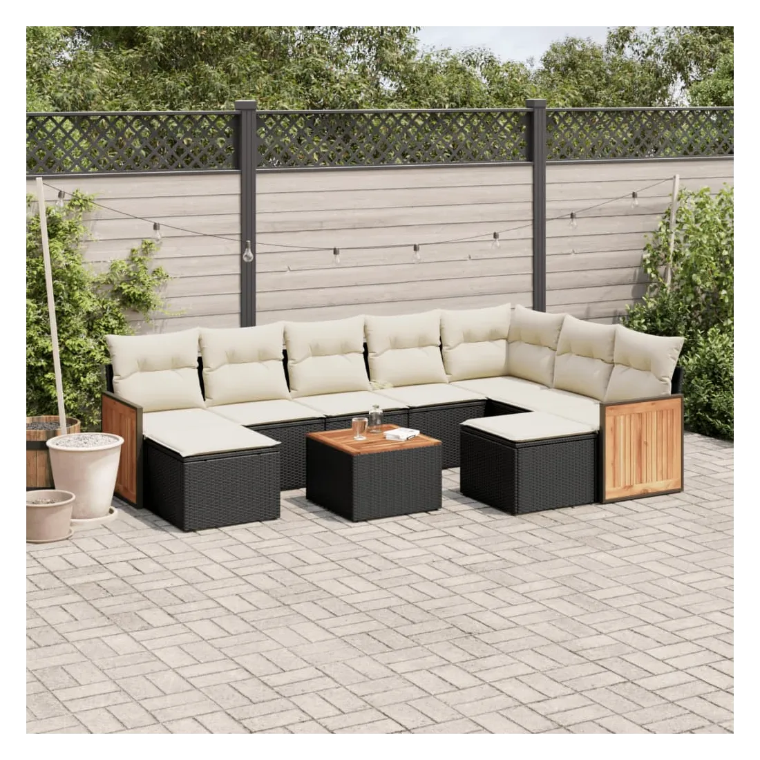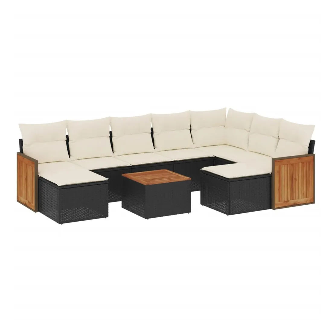 Cet ensemble de canapés de jardin est le complément parfait de votre arrière-cour, terrasse ou patio, offrant un espace confortable et accueillant pour discuter avec la famille et les amis ou simplement se détendre et profiter de l'extérieur. Matériau durable : la résine tressée, également connue sous le nom de poly rotin, est un matériau synthétique solide et nécessitant peu d'entretien qui ressemble au rotin naturel. Il est léger, facile à nettoyer et couramment utilisé pour les meubles d'extérieur en raison de sa durabilité et de ses propriétés de résistance aux intempéries.Expérience d'assise confortable : ce mobilier d'extérieur, doté de coussins épais, offre une expérience d'assise confortable.Dessus stable et facile à nettoyer : cette table de jardin a un dessus en bois d'acacia robuste, durable et facile à nettoyer avec un chiffon humide.Housse amovible et lavable : ces coussins de siège sont dotés de housses amovibles pour un lavage et un entretien faciles.Conception modulaire : cet ensemble de meubles d'extérieur a une conception modulaire, ce qui le rend complètement flexible et facile à déplacer, afin que vous puissiez créer un agencement de meubles d'extérieur personnalisé. Bon à savoir :Pour que vos meubles d'extérieur restent beaux, nous vous recommandons de les protéger avec une housse imperméable.