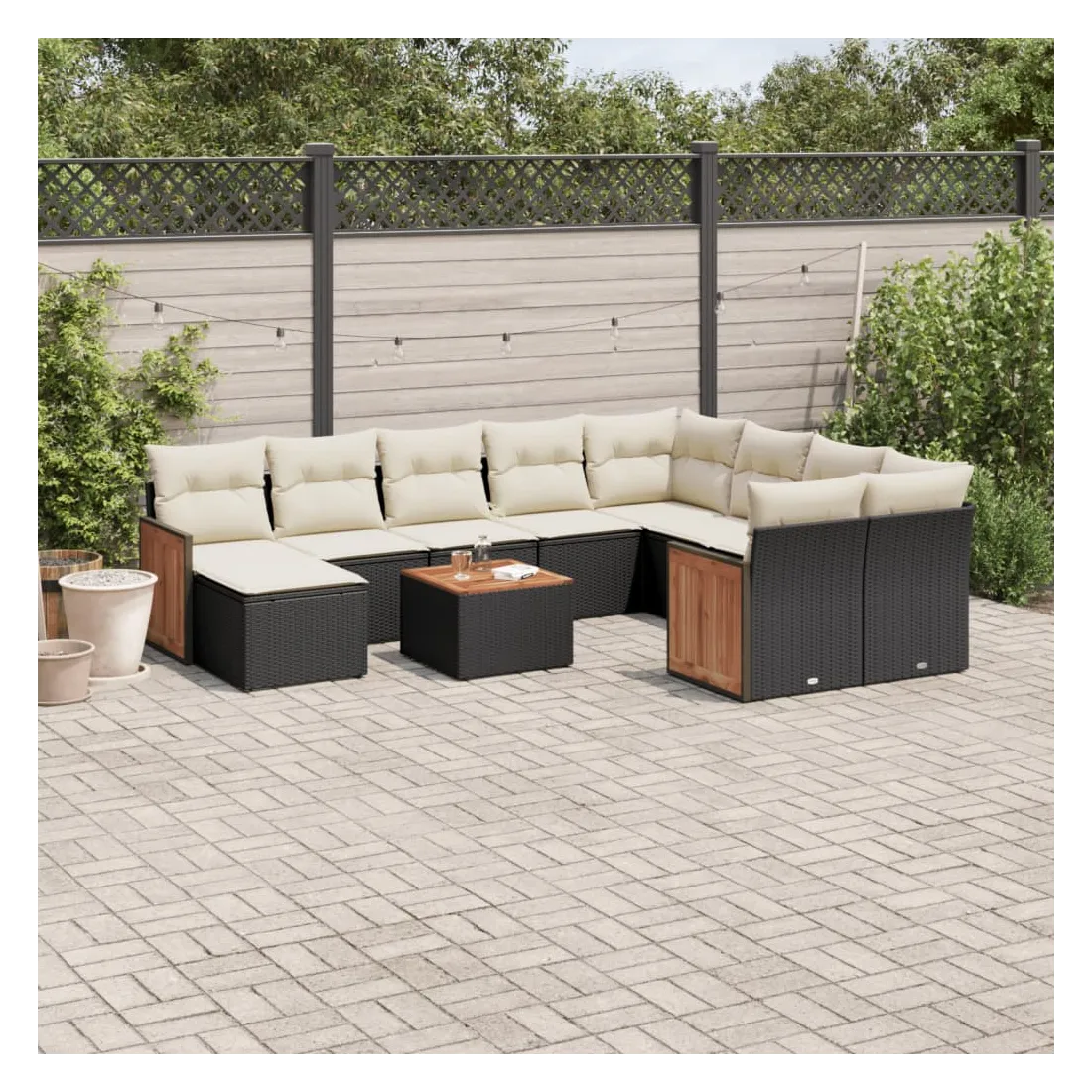 Cet ensemble de canapés de jardin est le complément parfait de votre arrière-cour, terrasse ou patio, offrant un espace confortable et accueillant pour discuter avec la famille et les amis ou simplement se détendre et profiter de l'extérieur. Matériau durable : la résine tressée, également connue sous le nom de poly rotin, est un matériau synthétique solide et nécessitant peu d'entretien qui ressemble au rotin naturel. Il est léger, facile à nettoyer et couramment utilisé pour les meubles d'extérieur en raison de sa durabilité et de ses propriétés de résistance aux intempéries.Expérience d'assise confortable : ce mobilier d'extérieur, doté de coussins épais, offre une expérience d'assise confortable.Dessus stable et facile à nettoyer : cette table de jardin a un dessus en bois d'acacia robuste, durable et facile à nettoyer avec un chiffon humide.Housse amovible et lavable : ces coussins de siège sont dotés de housses amovibles pour un lavage et un entretien faciles.Conception modulaire : cet ensemble de meubles d'extérieur a une conception modulaire, ce qui le rend complètement flexible et facile à déplacer, afin que vous puissiez créer un agencement de meubles d'extérieur personnalisé. Bon à savoir :Pour que vos meubles d'extérieur restent beaux, nous vous recommandons de les protéger avec une housse imperméable.