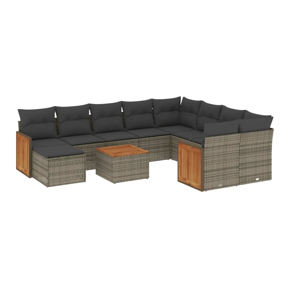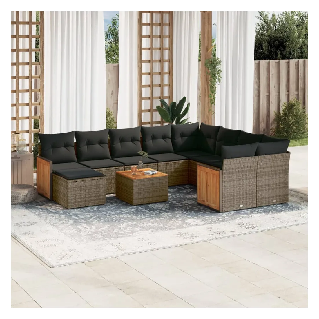 Cet ensemble de canapés de jardin est le complément parfait de votre arrière-cour, terrasse ou patio, offrant un espace confortable et accueillant pour discuter avec la famille et les amis ou simplement se détendre et profiter de l'extérieur. Matériau durable : la résine tressée, également connue sous le nom de poly rotin, est un matériau synthétique solide et nécessitant peu d'entretien qui ressemble au rotin naturel. Il est léger, facile à nettoyer et couramment utilisé pour les meubles d'extérieur en raison de sa durabilité et de ses propriétés de résistance aux intempéries.Expérience d'assise confortable : ce mobilier d'extérieur, doté de coussins épais, offre une expérience d'assise confortable.Dessus stable et facile à nettoyer : cette table de jardin a un dessus en bois d'acacia robuste, durable et facile à nettoyer avec un chiffon humide.Housse amovible et lavable : ces coussins de siège sont dotés de housses amovibles pour un lavage et un entretien faciles.Conception modulaire : cet ensemble de meubles d'extérieur a une conception modulaire, ce qui le rend complètement flexible et facile à déplacer, afin que vous puissiez créer un agencement de meubles d'extérieur personnalisé. Bon à savoir :Pour que vos meubles d'extérieur restent beaux, nous vous recommandons de les protéger avec une housse imperméable.