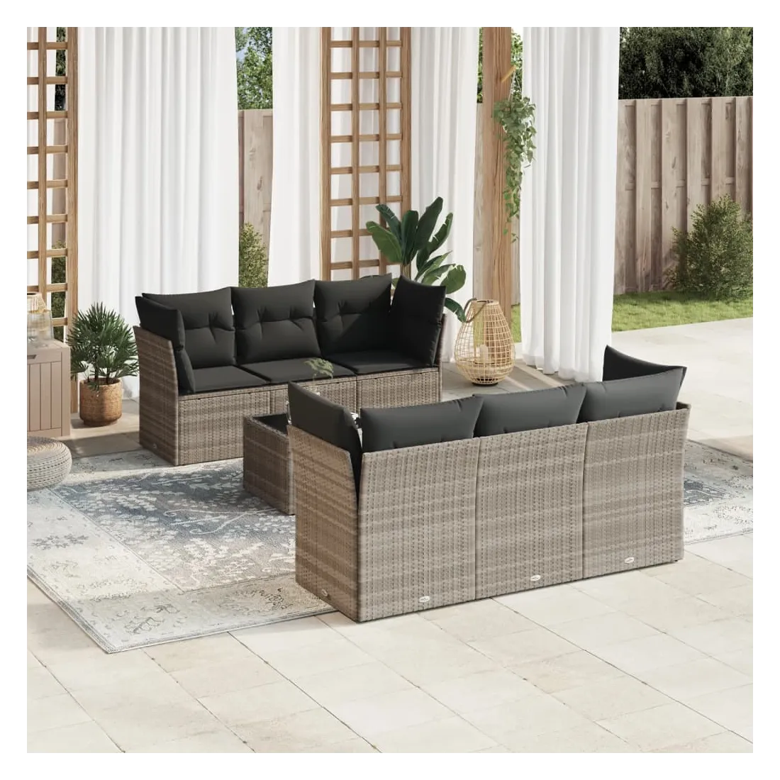 Cet ensemble de canapés de jardin est le complément parfait de votre arrière-cour, terrasse ou patio, offrant un espace confortable et accueillant pour discuter avec la famille et les amis ou simplement se détendre et profiter de l'extérieur. Matériau durable : la résine tressée, également connue sous le nom de poly rotin, est un matériau synthétique solide et nécessitant peu d'entretien qui ressemble au rotin naturel. Il est léger, facile à nettoyer et couramment utilisé pour les meubles d'extérieur en raison de sa durabilité et de ses propriétés de résistance aux intempéries.Fonction de rangement avec sac résistant à l'eau : chaque siège de jardin dispose d'un espace de rangement sous l'assise, complété par un sac résistant à l'eau pour ranger les coussins, les jouets et d'autres objets. Les sacs intérieurs sont dotés d'un couvercle et peuvent être solidement fixés aux sièges à l'aide de bandes auto-agrippantes pour plus de stabilité.Dessus en verre : le dessus de la table d'extérieur est fabriqué en verre trempé solide et durable, ce qui le rend facile à nettoyer avec un chiffon humide et ajoute une touche d'élégance à votre espace extérieur.Housse amovible et lavable : ces coussins de siège sont dotés de housses amovibles pour un lavage et un entretien faciles.Conception modulaire : cet ensemble de meubles d'extérieur a une conception modulaire, ce qui le rend complètement flexible et facile à déplacer, afin que vous puissiez créer un agencement de meubles d'extérieur personnalisé. Bon à savoir :Pour que vos meubles d'extérieur restent beaux, nous vous recommandons de les protéger avec une housse imperméable.