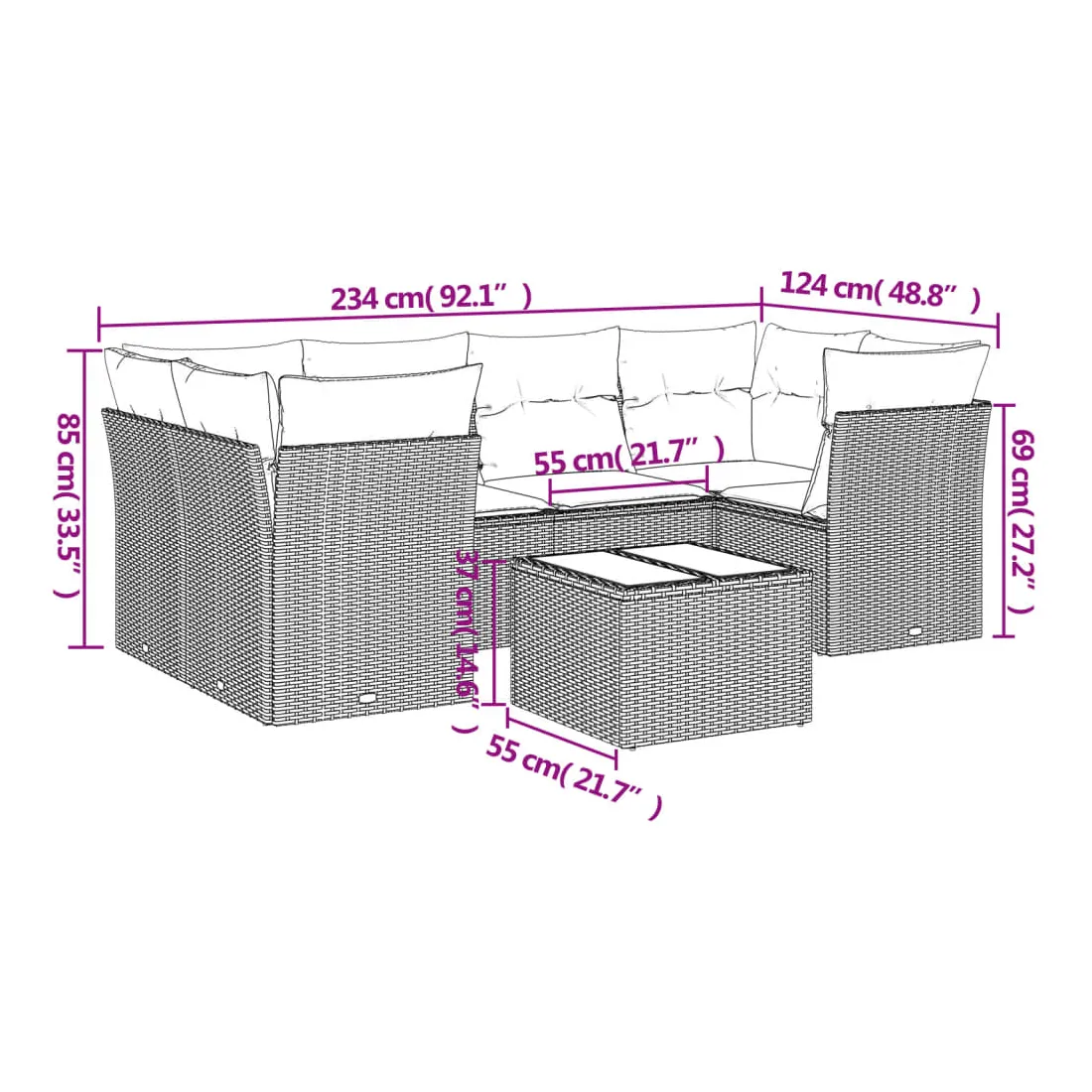 - Dimensions totales du canapé : 234 x 124 x 69 cm (l x P x H)