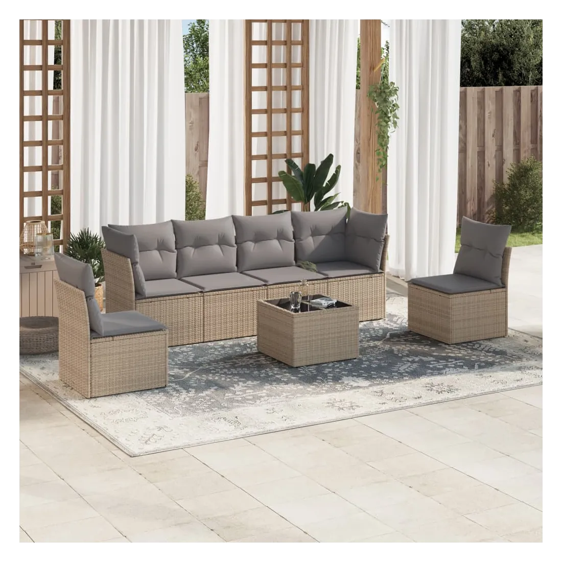 Cet ensemble de canapés de jardin est le complément parfait de votre arrière-cour, terrasse ou patio, offrant un espace confortable et accueillant pour discuter avec la famille et les amis ou simplement se détendre et profiter de l'extérieur. Matériau durable : la résine tressée, également connue sous le nom de poly rotin, est un matériau synthétique solide et nécessitant peu d'entretien qui ressemble au rotin naturel. Il est léger, facile à nettoyer et couramment utilisé pour les meubles d'extérieur en raison de sa durabilité et de ses propriétés de résistance aux intempéries.Fonction de rangement avec sac résistant à l'eau : chaque siège de jardin dispose d'un espace de rangement sous l'assise, complété par un sac résistant à l'eau pour ranger les coussins, les jouets et d'autres objets. Les sacs intérieurs sont dotés d'un couvercle et peuvent être solidement fixés aux sièges à l'aide de bandes auto-agrippantes pour plus de stabilité.Dessus en verre : le dessus de la table d'extérieur est fabriqué en verre trempé solide et durable, ce qui le rend facile à nettoyer avec un chiffon humide et ajoute une touche d'élégance à votre espace extérieur.Housse amovible et lavable : ces coussins de siège sont dotés de housses amovibles pour un lavage et un entretien faciles.Conception modulaire : cet ensemble de meubles d'extérieur a une conception modulaire, ce qui le rend complètement flexible et facile à déplacer, afin que vous puissiez créer un agencement de meubles d'extérieur personnalisé. Bon à savoir :Pour que vos meubles d'extérieur restent beaux, nous vous recommandons de les protéger avec une housse imperméable.