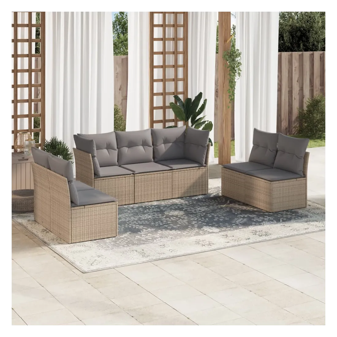 Cet ensemble de canapés de jardin est le complément parfait de votre arrière-cour, terrasse ou patio, offrant un espace confortable et accueillant pour discuter avec la famille et les amis ou simplement se détendre et profiter de l'extérieur. Matériau durable : la résine tressée, également connue sous le nom de poly rotin, est un matériau synthétique solide et nécessitant peu d'entretien qui ressemble au rotin naturel. Il est léger, facile à nettoyer et couramment utilisé pour les meubles d'extérieur en raison de sa durabilité et de ses propriétés de résistance aux intempéries.Fonction de rangement avec sac résistant à l'eau : chaque siège de jardin dispose d'un espace de rangement sous l'assise, complété par un sac résistant à l'eau pour ranger les coussins, les jouets et d'autres objets. Les sacs intérieurs sont dotés d'un couvercle et peuvent être solidement fixés aux sièges à l'aide de bandes auto-agrippantes pour plus de stabilité.Housse amovible et lavable : ces coussins de siège sont dotés de housses amovibles pour un lavage et un entretien faciles.Conception modulaire : cet ensemble de meubles d'extérieur a une conception modulaire, ce qui le rend complètement flexible et facile à déplacer, afin que vous puissiez créer un agencement de meubles d'extérieur personnalisé. Bon à savoir :Pour que vos meubles d'extérieur restent beaux, nous vous recommandons de les protéger avec une housse imperméable.