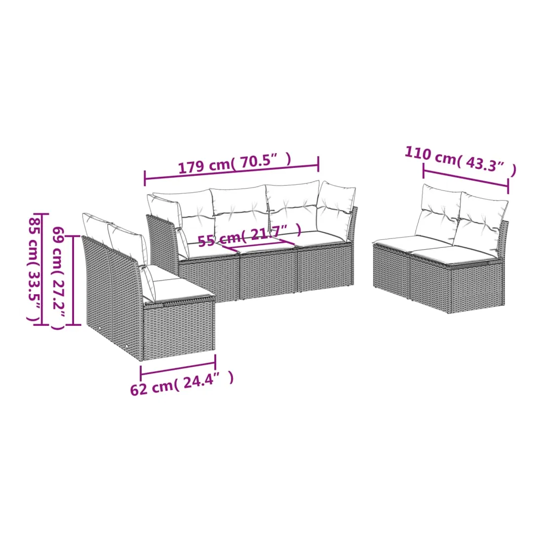 - Dimensions totales du canapé 3 places : 179 x 62 x 69 cm (l x P x H)