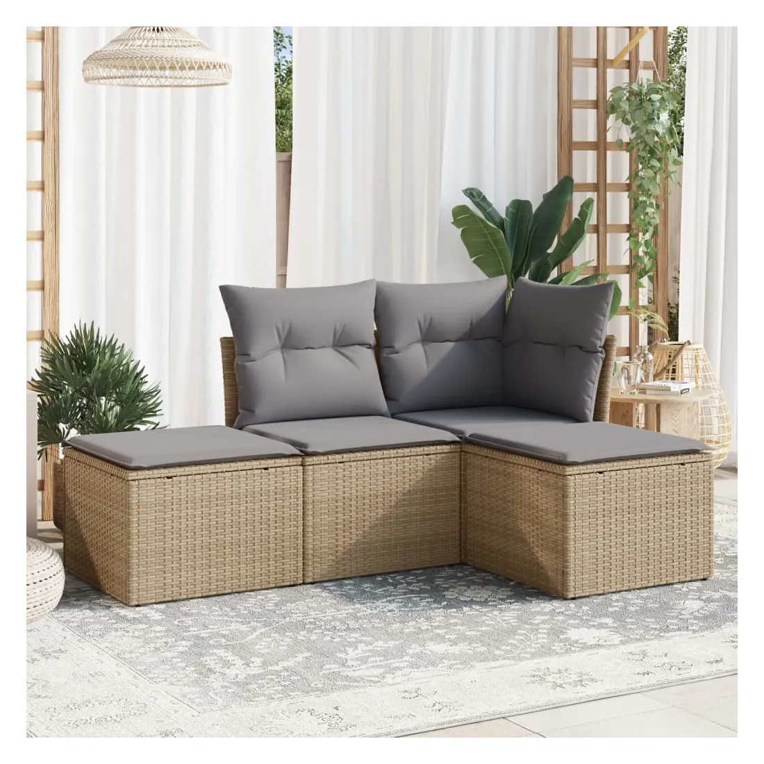 Cet ensemble de canapés de jardin est le complément parfait de votre arrière-cour, terrasse ou patio, offrant un espace confortable et accueillant pour discuter avec la famille et les amis ou simplement se détendre et profiter de l'extérieur. Matériau durable : la résine tressée, également connue sous le nom de poly rotin, est un matériau synthétique solide et nécessitant peu d'entretien qui ressemble au rotin naturel. Il est léger, facile à nettoyer et couramment utilisé pour les meubles d'extérieur en raison de sa durabilité et de ses propriétés de résistance aux intempéries.Fonction de rangement avec sac résistant à l'eau : chaque siège de jardin dispose d'un espace de rangement sous l'assise, complété par un sac résistant à l'eau pour ranger les coussins, les jouets et d'autres objets. Les sacs intérieurs sont dotés d'un couvercle et peuvent être solidement fixés aux sièges à l'aide de bandes auto-agrippantes pour plus de stabilité.Housse amovible et lavable : ces coussins de siège sont dotés de housses amovibles pour un lavage et un entretien faciles.Conception modulaire : cet ensemble de meubles d'extérieur a une conception modulaire, ce qui le rend complètement flexible et facile à déplacer, afin que vous puissiez créer un agencement de meubles d'extérieur personnalisé. Bon à savoir :Pour que vos meubles d'extérieur restent beaux, nous vous recommandons de les protéger avec une housse imperméable.