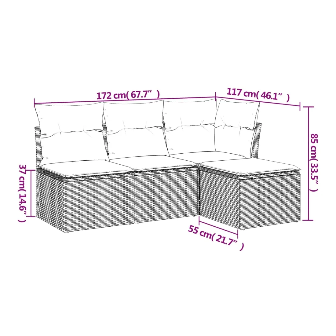 - Dimensions totales du canapé : 172 x 117 x 69 cm (l x P x H)