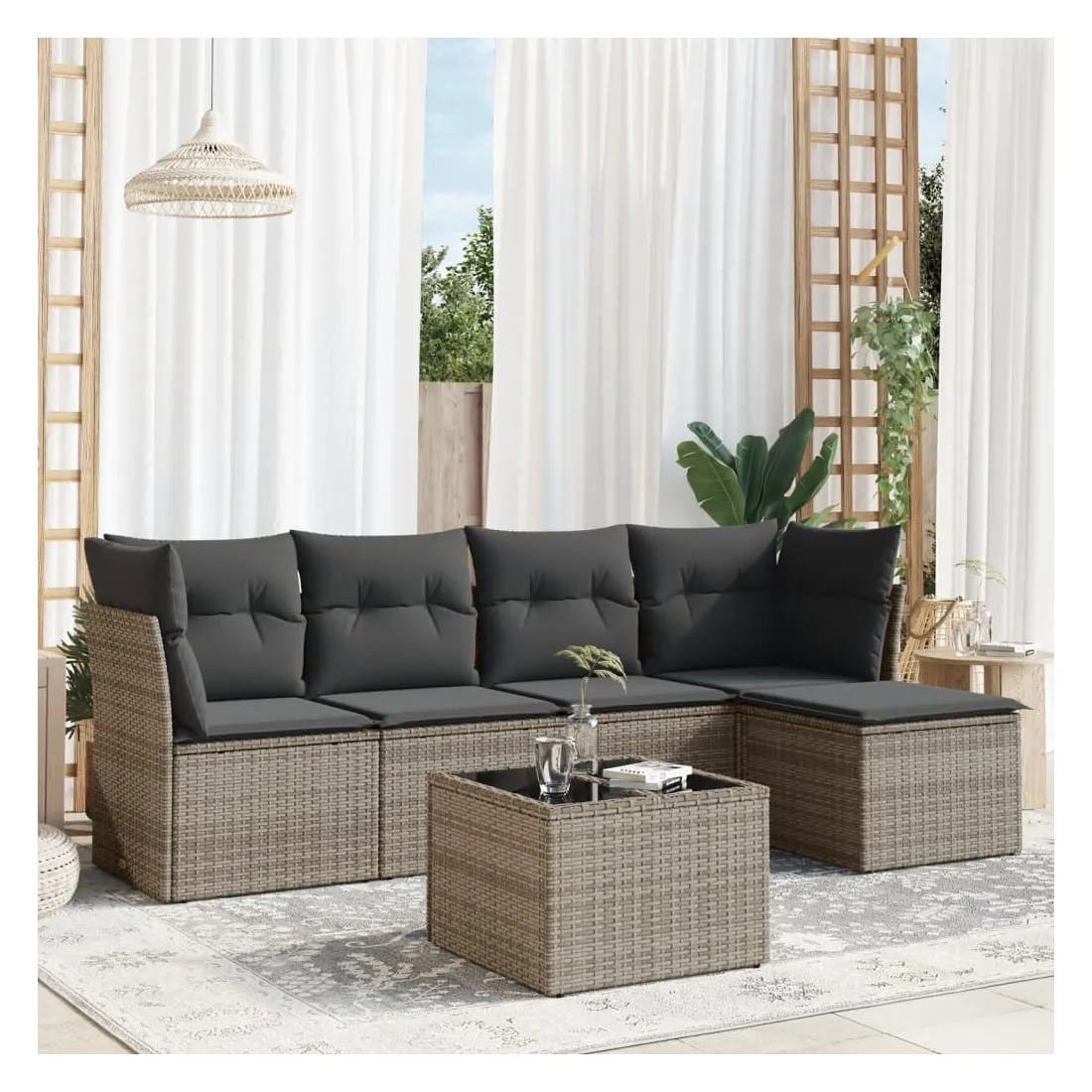 Cet ensemble de canapés de jardin est le complément parfait de votre arrière-cour, terrasse ou patio, offrant un espace confortable et accueillant pour discuter avec la famille et les amis ou simplement se détendre et profiter de l'extérieur. Matériau durable : la résine tressée, également connue sous le nom de poly rotin, est un matériau synthétique solide et nécessitant peu d'entretien qui ressemble au rotin naturel. Il est léger, facile à nettoyer et couramment utilisé pour les meubles d'extérieur en raison de sa durabilité et de ses propriétés de résistance aux intempéries.Fonction de rangement avec sac résistant à l'eau : chaque siège de jardin dispose d'un espace de rangement sous l'assise, complété par un sac résistant à l'eau pour ranger les coussins, les jouets et d'autres objets. Les sacs intérieurs sont dotés d'un couvercle et peuvent être solidement fixés aux sièges à l'aide de bandes auto-agrippantes pour plus de stabilité.Dessus en verre : le dessus de la table d'extérieur est fabriqué en verre trempé solide et durable, ce qui le rend facile à nettoyer avec un chiffon humide et ajoute une touche d'élégance à votre espace extérieur.Housse amovible et lavable : ces coussins de siège sont dotés de housses amovibles pour un lavage et un entretien faciles.Conception modulaire : cet ensemble de meubles d'extérieur a une conception modulaire, ce qui le rend complètement flexible et facile à déplacer, afin que vous puissiez créer un agencement de meubles d'extérieur personnalisé. Bon à savoir :Pour que vos meubles d'extérieur restent beaux, nous vous recommandons de les protéger avec une housse imperméable.