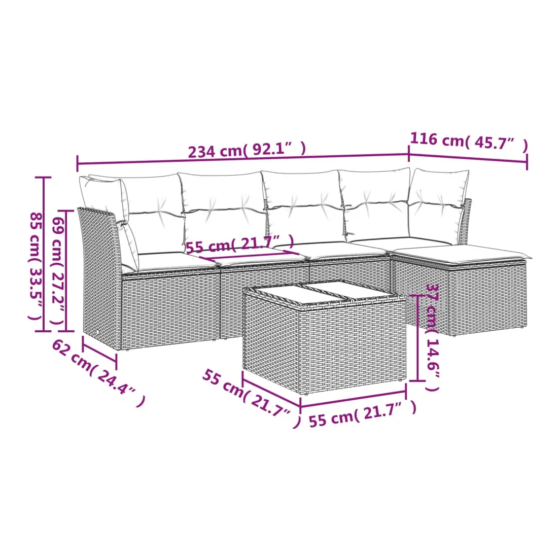 - Dimensions totales du canapé : 234 x 117 x 69 cm (l x P x H)