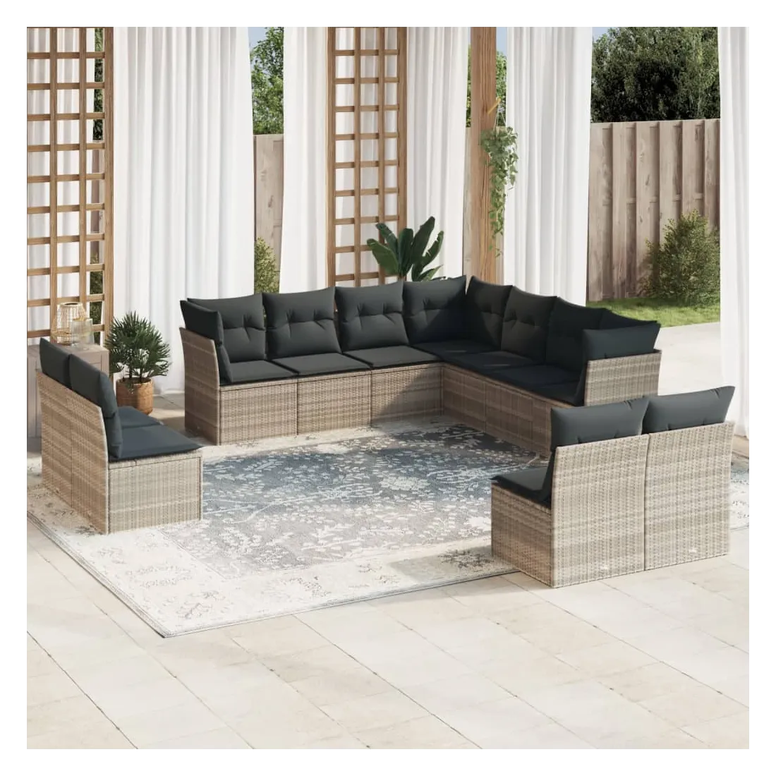 Cet ensemble de canapés de jardin est le complément parfait de votre arrière-cour, terrasse ou patio, offrant un espace confortable et accueillant pour discuter avec la famille et les amis ou simplement se détendre et profiter de l'extérieur. Matériau durable : la résine tressée, également connue sous le nom de poly rotin, est un matériau synthétique solide et nécessitant peu d'entretien qui ressemble au rotin naturel. Il est léger, facile à nettoyer et couramment utilisé pour les meubles d'extérieur en raison de sa durabilité et de ses propriétés de résistance aux intempéries.Fonction de rangement avec sac résistant à l'eau : chaque siège de jardin dispose d'un espace de rangement sous l'assise, complété par un sac résistant à l'eau pour ranger les coussins, les jouets et d'autres objets. Les sacs intérieurs sont dotés d'un couvercle et peuvent être solidement fixés aux sièges à l'aide de bandes auto-agrippantes pour plus de stabilité.Housse amovible et lavable : ces coussins de siège sont dotés de housses amovibles pour un lavage et un entretien faciles.Conception modulaire : cet ensemble de meubles d'extérieur a une conception modulaire, ce qui le rend complètement flexible et facile à déplacer, afin que vous puissiez créer un agencement de meubles d'extérieur personnalisé. Bon à savoir :Pour que vos meubles d'extérieur restent beaux, nous vous recommandons de les protéger avec une housse imperméable.