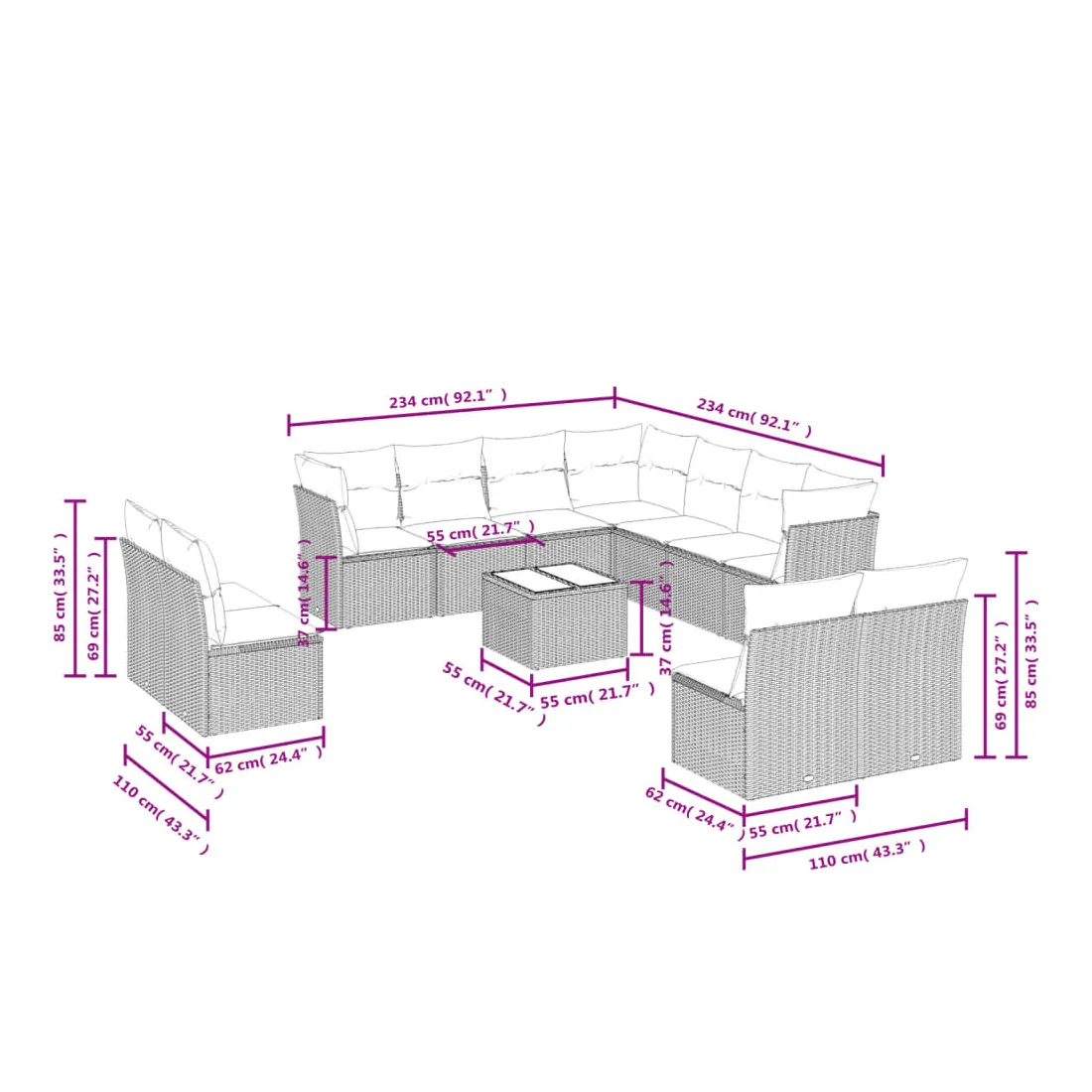 - Dimensions totales du canapé 7 places : 234 x 234 x 69 cm (l x P x H)