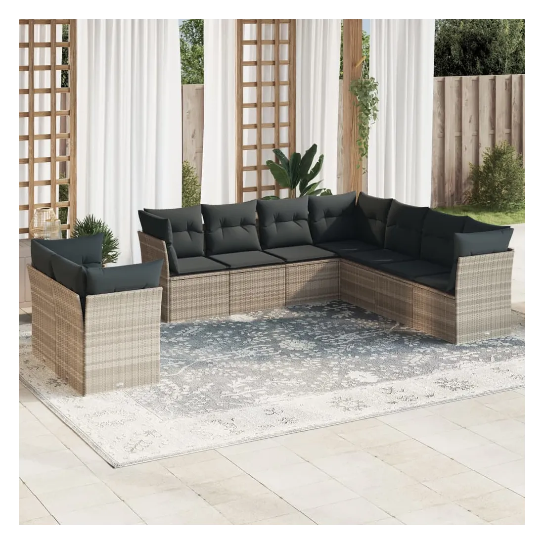 Cet ensemble de canapés de jardin est le complément parfait de votre arrière-cour, terrasse ou patio, offrant un espace confortable et accueillant pour discuter avec la famille et les amis ou simplement se détendre et profiter de l'extérieur. Matériau durable : la résine tressée, également connue sous le nom de poly rotin, est un matériau synthétique solide et nécessitant peu d'entretien qui ressemble au rotin naturel. Il est léger, facile à nettoyer et couramment utilisé pour les meubles d'extérieur en raison de sa durabilité et de ses propriétés de résistance aux intempéries.Fonction de rangement avec sac résistant à l'eau : chaque siège de jardin dispose d'un espace de rangement sous l'assise, complété par un sac résistant à l'eau pour ranger les coussins, les jouets et d'autres objets. Les sacs intérieurs sont dotés d'un couvercle et peuvent être solidement fixés aux sièges à l'aide de bandes auto-agrippantes pour plus de stabilité.Housse amovible et lavable : ces coussins de siège sont dotés de housses amovibles pour un lavage et un entretien faciles.Conception modulaire : cet ensemble de meubles d'extérieur a une conception modulaire, ce qui le rend complètement flexible et facile à déplacer, afin que vous puissiez créer un agencement de meubles d'extérieur personnalisé. Bon à savoir :Pour que vos meubles d'extérieur restent beaux, nous vous recommandons de les protéger avec une housse imperméable.
