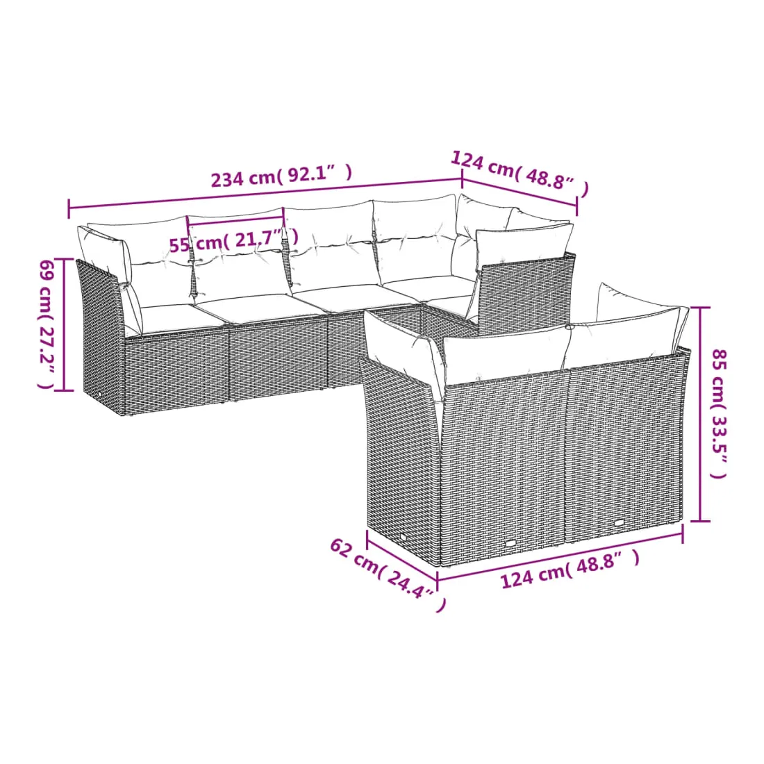 - Dimensions totales du canapé 5 places : 234 x 124 x 69 cm (l x P x H)