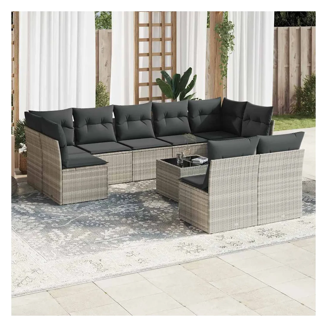 Cet ensemble de canapés de jardin est le complément parfait de votre arrière-cour, terrasse ou patio, offrant un espace confortable et accueillant pour discuter avec la famille et les amis ou simplement se détendre et profiter de l'extérieur. Matériau durable : la résine tressée, également connue sous le nom de poly rotin, est un matériau synthétique solide et nécessitant peu d'entretien qui ressemble au rotin naturel. Il est léger, facile à nettoyer et couramment utilisé pour les meubles d'extérieur en raison de sa durabilité et de ses propriétés de résistance aux intempéries.Fonction de rangement avec sac résistant à l'eau : chaque siège de jardin dispose d'un espace de rangement sous l'assise, complété par un sac résistant à l'eau pour ranger les coussins, les jouets et d'autres objets. Les sacs intérieurs sont dotés d'un couvercle et peuvent être solidement fixés aux sièges à l'aide de bandes auto-agrippantes pour plus de stabilité.Dessus en verre : le dessus de la table d'extérieur est fabriqué en verre trempé solide et durable, ce qui le rend facile à nettoyer avec un chiffon humide et ajoute une touche d'élégance à votre espace extérieur.Housse amovible et lavable : ces coussins de siège sont dotés de housses amovibles pour un lavage et un entretien faciles.Conception modulaire : cet ensemble de meubles d'extérieur a une conception modulaire, ce qui le rend complètement flexible et facile à déplacer, afin que vous puissiez créer un agencement de meubles d'extérieur personnalisé. Bon à savoir :Pour que vos meubles d'extérieur restent beaux, nous vous recommandons de les protéger avec une housse imperméable.