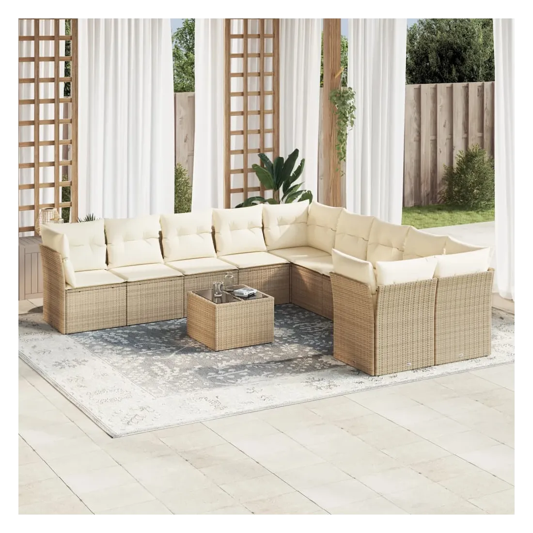 Cet ensemble de canapés de jardin est le complément parfait de votre arrière-cour, terrasse ou patio, offrant un espace confortable et accueillant pour discuter avec la famille et les amis ou simplement se détendre et profiter de l'extérieur. Matériau durable : la résine tressée, également connue sous le nom de poly rotin, est un matériau synthétique solide et nécessitant peu d'entretien qui ressemble au rotin naturel. Il est léger, facile à nettoyer et couramment utilisé pour les meubles d'extérieur en raison de sa durabilité et de ses propriétés de résistance aux intempéries.Fonction de rangement avec sac résistant à l'eau : chaque siège de jardin dispose d'un espace de rangement sous l'assise, complété par un sac résistant à l'eau pour ranger les coussins, les jouets et d'autres objets. Les sacs intérieurs sont dotés d'un couvercle et peuvent être solidement fixés aux sièges à l'aide de bandes auto-agrippantes pour plus de stabilité.Dessus en verre : le dessus de la table d'extérieur est fabriqué en verre trempé solide et durable, ce qui le rend facile à nettoyer avec un chiffon humide et ajoute une touche d'élégance à votre espace extérieur.Housse amovible et lavable : ces coussins de siège sont dotés de housses amovibles pour un lavage et un entretien faciles.Conception modulaire : cet ensemble de meubles d'extérieur a une conception modulaire, ce qui le rend complètement flexible et facile à déplacer, afin que vous puissiez créer un agencement de meubles d'extérieur personnalisé. Bon à savoir :Pour que vos meubles d'extérieur restent beaux, nous vous recommandons de les protéger avec une housse imperméable.