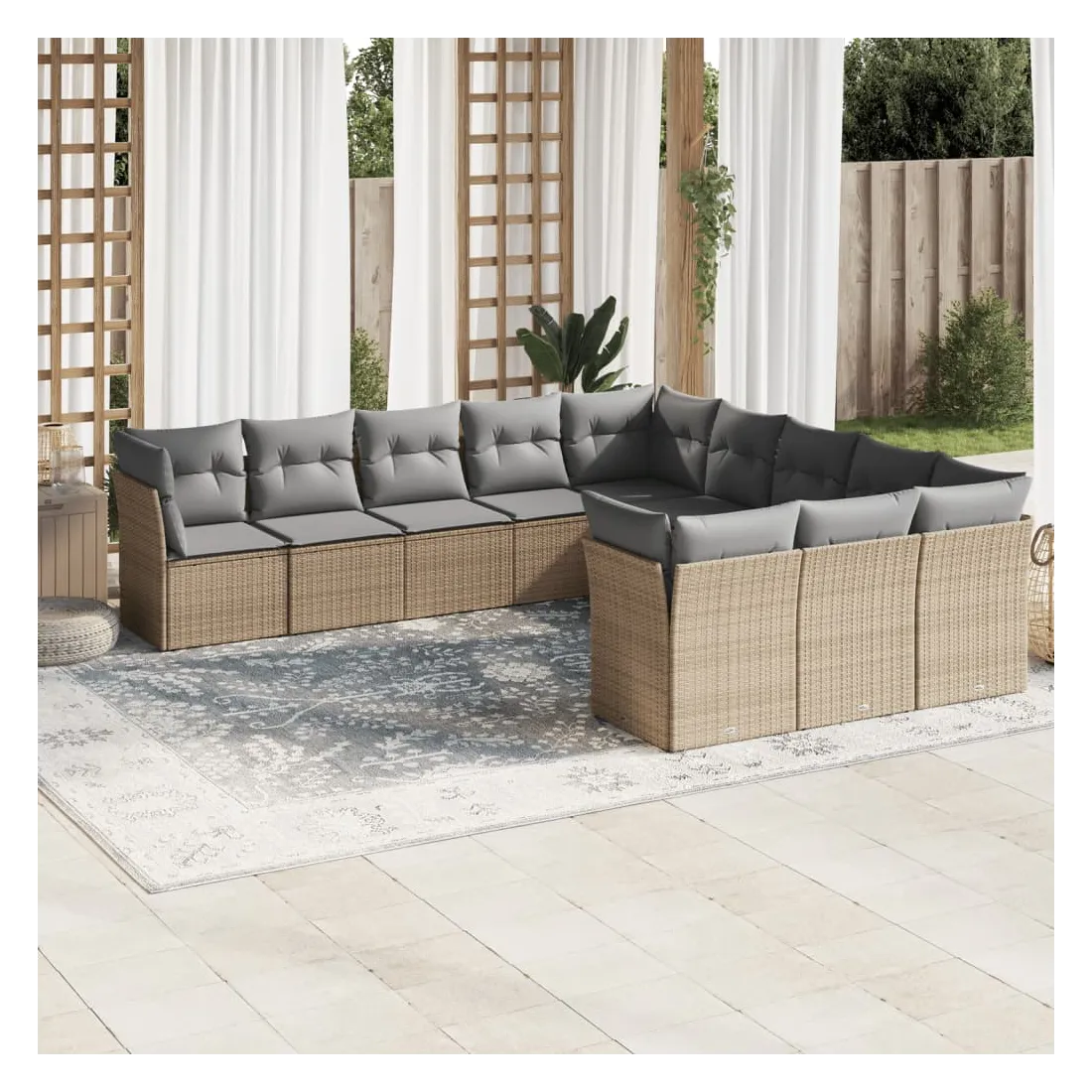 Cet ensemble de canapés de jardin est le complément parfait de votre arrière-cour, terrasse ou patio, offrant un espace confortable et accueillant pour discuter avec la famille et les amis ou simplement se détendre et profiter de l'extérieur. Matériau durable : la résine tressée, également connue sous le nom de poly rotin, est un matériau synthétique solide et nécessitant peu d'entretien qui ressemble au rotin naturel. Il est léger, facile à nettoyer et couramment utilisé pour les meubles d'extérieur en raison de sa durabilité et de ses propriétés de résistance aux intempéries.Fonction de rangement avec sac résistant à l'eau : chaque siège de jardin dispose d'un espace de rangement sous l'assise, complété par un sac résistant à l'eau pour ranger les coussins, les jouets et d'autres objets. Les sacs intérieurs sont dotés d'un couvercle et peuvent être solidement fixés aux sièges à l'aide de bandes auto-agrippantes pour plus de stabilité.Housse amovible et lavable : ces coussins de siège sont dotés de housses amovibles pour un lavage et un entretien faciles.Conception modulaire : cet ensemble de meubles d'extérieur a une conception modulaire, ce qui le rend complètement flexible et facile à déplacer, afin que vous puissiez créer un agencement de meubles d'extérieur personnalisé. Bon à savoir :Pour que vos meubles d'extérieur restent beaux, nous vous recommandons de les protéger avec une housse imperméable.