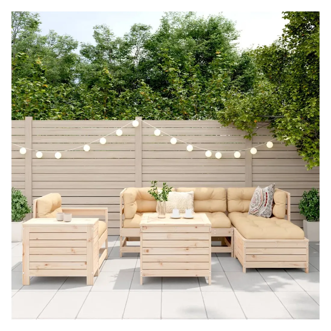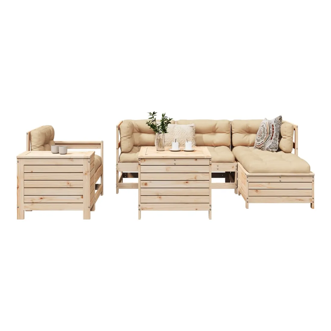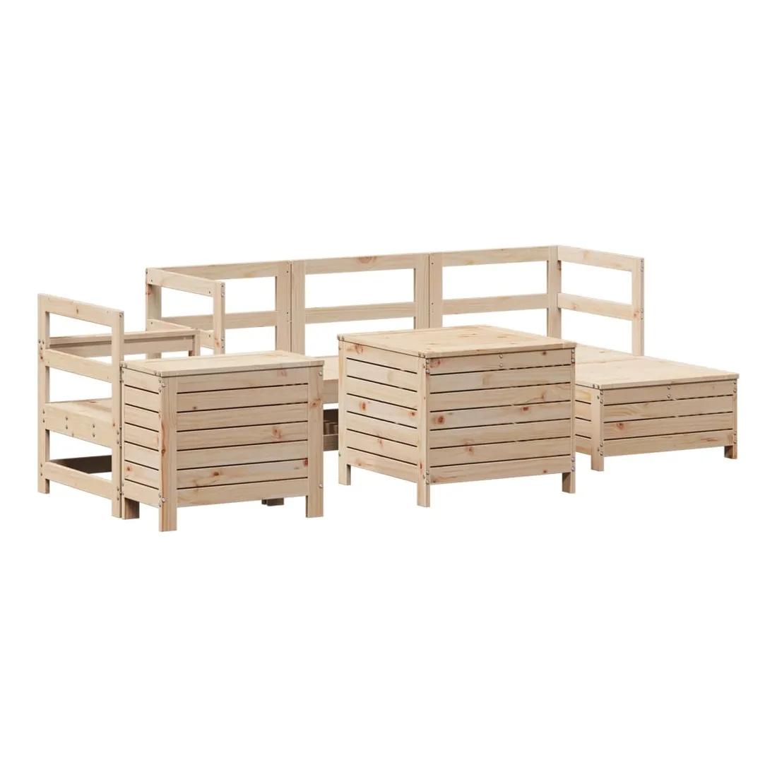 vidaXLCet ensemble de salon de jardin en bois avec un design à lattes sera un excellent complément à votre jardin, patio ou terrasse pour profiter d'un moment agréable avec votre famille ou vos amis. Matériau robuste et durable : le bois de pin massif est connu pour sa résistance et sa durabilité. Ses grains droits et ses nœuds distinctifs contribuent à son charme rustique. Bien ventilé et prévention de l'accumulation d'eau : la conception à lattes favorise une circulation optimale de l'air et empêche efficacement l'accumulation d'eau, assurant ainsi une assise sèche et confortable. Utilisation polyvalente : le repose-pied de jardin peut non seulement être utilisé pour s'asseoir ou se détendre, mais il peut également être utilisé comme table basse pour contenir vos boissons, votre nourriture et d'autres décorations. Table pratique : la table de jardin vous offre un endroit pratique pour atteindre facilement vos essentiels. Conception modulaire : cet ensemble de meubles d'extérieur a une conception modulaire, ce qui le rend complètement flexible et facile à déplacer, afin que vous puissiez créer un agencement de meubles d'extérieur personnalisé. Bon à savoir :Pour que vos meubles d'extérieur restent beaux, nous vous recommandons de les protéger avec une housse imperméable.