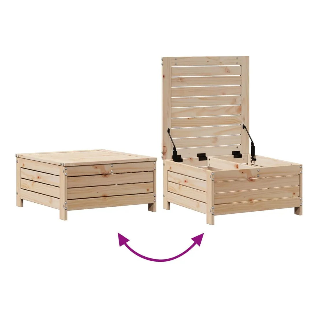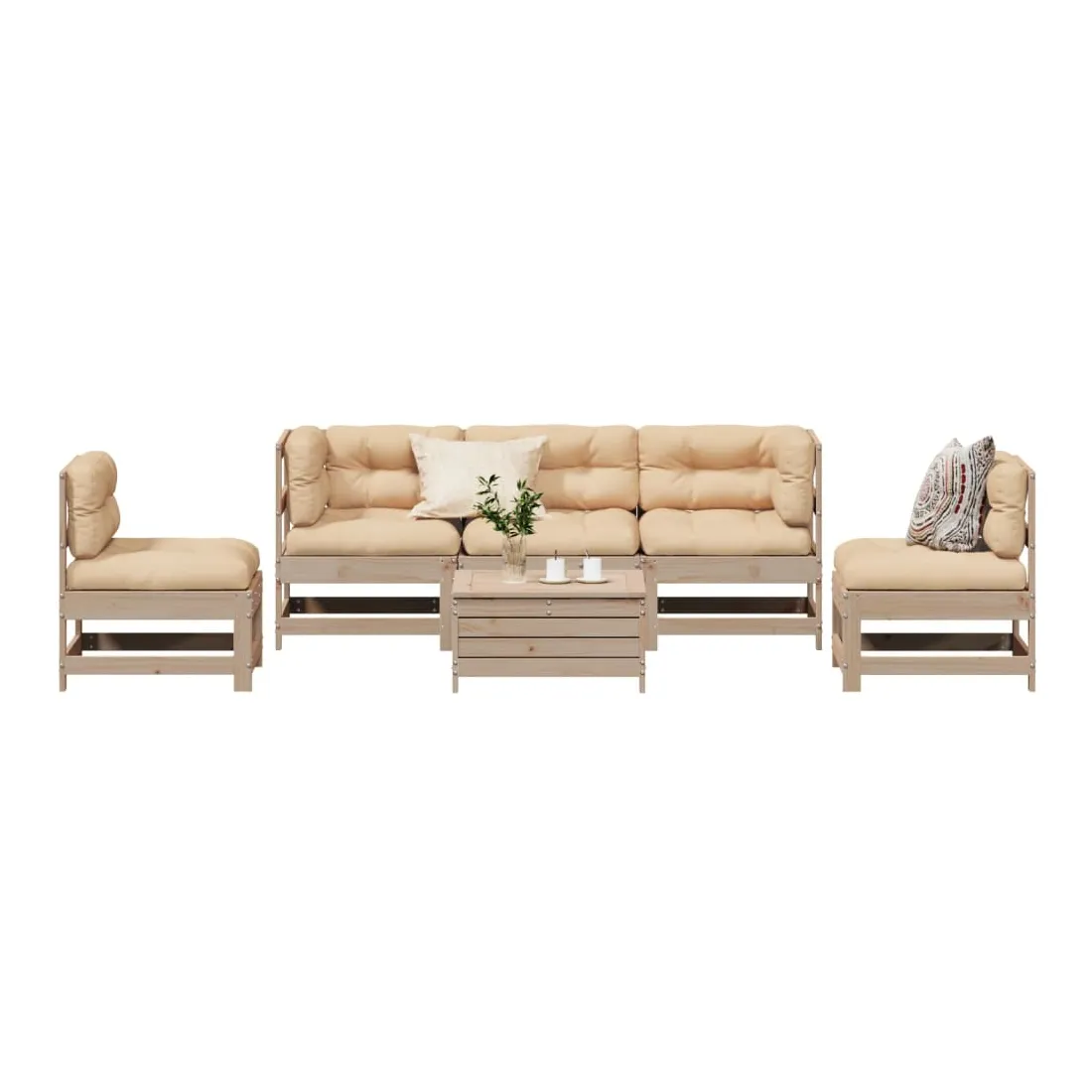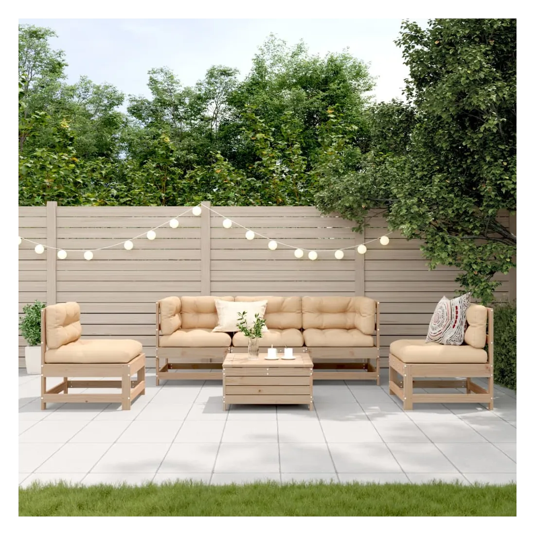 Cet ensemble de salon de jardin en bois avec un design à lattes sera un excellent complément à votre jardin, patio ou terrasse pour profiter d'un moment agréable avec votre famille ou vos amis. Bois de pin massif : le bois de pin massif est un matériau naturel magnifique. Le bois de pin a un grain droit et les nœuds donnent au matériau son aspect caractéristique et rustique.Design à lattes : le design à lattes de la chaise de jardin en bois empêche l'accumulation de l'eau, ce qui permet de garder le siège au sec et d'éviter un pourrissement inutile.Expérience d'assise confortable : le dossier et l'accoudoir ajoutent un confort d'assise supplémentaire à l'ensemble de meubles de jardin. De plus, le coussin bien rembourré vous permet de vous asseoir confortablement.Utilisation polyvalente : le pouf d'extérieur avec couvercle peut non seulement être utilisé pour s'asseoir ou se détendre, mais il peut également être utilisé comme table basse pour contenir vos boissons, votre nourriture et le meuble de jardin dispose d'un espace de rangement sous le siège. Conception modulaire : cet ensemble de meubles d'extérieur a une conception modulaire, ce qui le rend complètement flexible et facile à déplacer, afin que vous puissiez créer un agencement de meubles d'extérieur personnalisé. Bon à savoir :Pour que vos meubles d'extérieur restent beaux, nous vous recommandons de les protéger avec une housse imperméable.