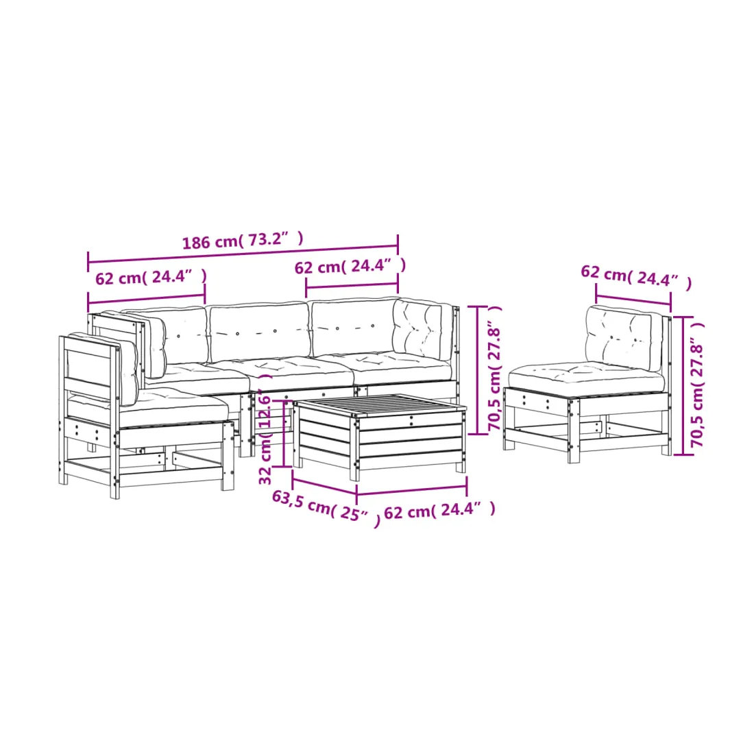 - Dimensions du canapé central de jardin : 62 x 62 x 70,5 cm (l x P x H)