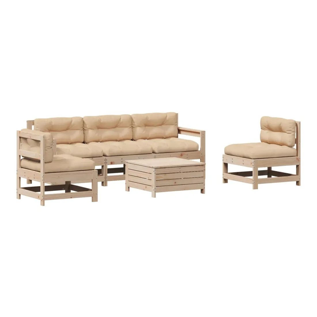 Cet ensemble de salon de jardin en bois avec un design à lattes sera un excellent complément à votre jardin, patio ou terrasse pour profiter d'un moment agréable avec votre famille ou vos amis. Bois de pin massif : le bois de pin massif est un matériau naturel magnifique. Le bois de pin a un grain droit et les nœuds donnent au matériau son aspect caractéristique et rustique.Design à lattes : le design à lattes de la chaise de jardin en bois empêche l'accumulation de l'eau, ce qui permet de garder le siège au sec et d'éviter un pourrissement inutile.Expérience d'assise confortable : le dossier et l'accoudoir ajoutent un confort d'assise supplémentaire à l'ensemble de meubles de jardin. De plus, le coussin bien rembourré vous permet de vous asseoir confortablement.Utilisation polyvalente : le pouf d'extérieur avec couvercle peut non seulement être utilisé pour s'asseoir ou se détendre, mais il peut également être utilisé comme table basse pour contenir vos boissons, votre nourriture et le meuble de jardin dispose d'un espace de rangement sous le siège. Conception modulaire : cet ensemble de meubles d'extérieur a une conception modulaire, ce qui le rend complètement flexible et facile à déplacer, afin que vous puissiez créer un agencement de meubles d'extérieur personnalisé. Bon à savoir :Pour que vos meubles d'extérieur restent beaux, nous vous recommandons de les protéger avec une housse imperméable.