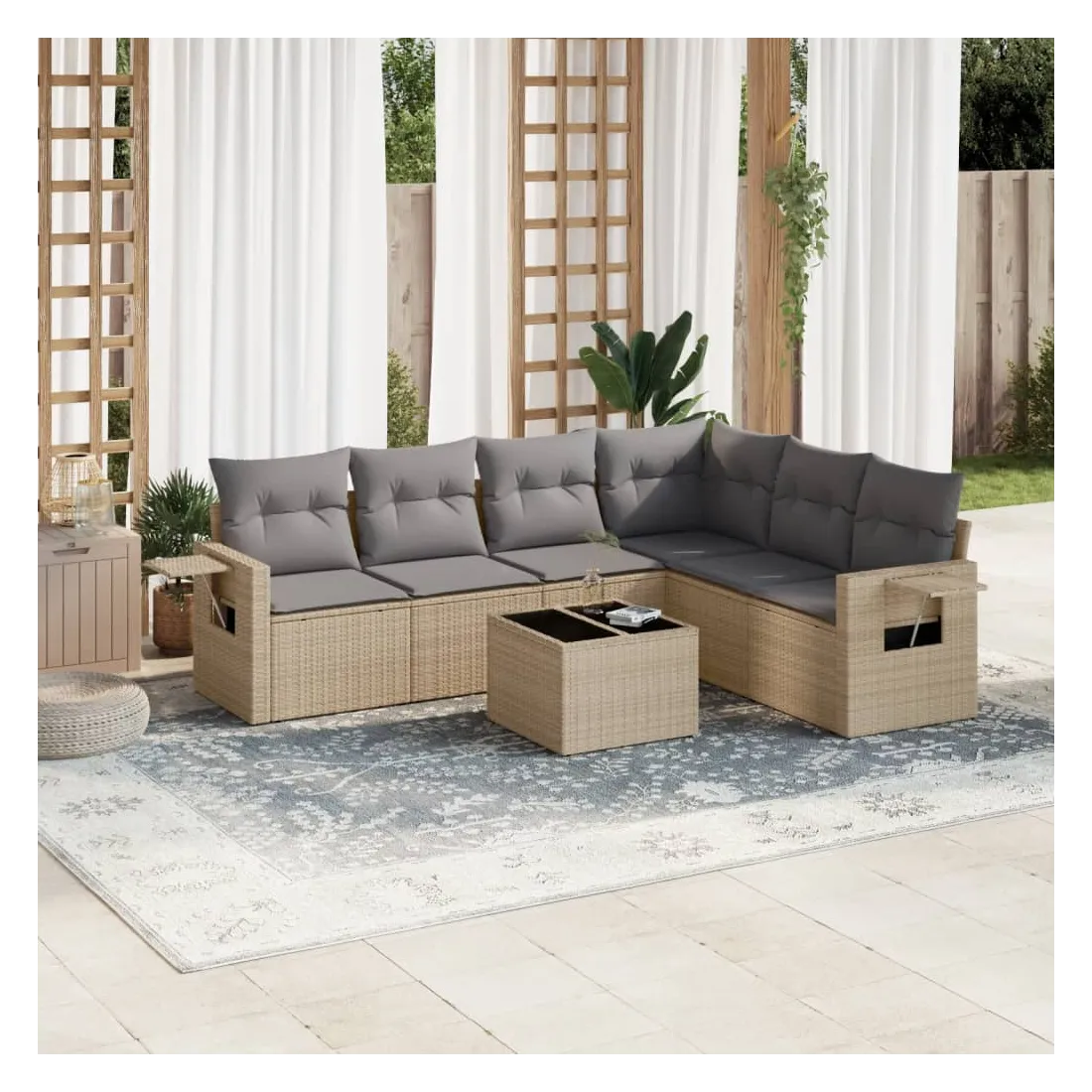 Cet ensemble de canapés de jardin est le complément parfait de votre arrière-cour, terrasse ou patio, offrant un espace confortable et accueillant pour discuter avec la famille et les amis ou simplement se détendre et profiter de l'extérieur. Matériau durable : la résine tressée, également connue sous le nom de poly rotin, est un matériau synthétique solide et nécessitant peu d'entretien qui ressemble au rotin naturel. Il est léger, facile à nettoyer et couramment utilisé pour les meubles d'extérieur en raison de sa durabilité et de ses propriétés de résistance aux intempéries.Fonction de rangement avec sac résistant à l'eau : le mobilier de jardin dispose d'un espace de rangement sous l'assise, complété par un sac résistant à l'eau pour ranger coussins, jouets et autres objets. Le sac intérieur peut être solidement fixé au mobilier d'extérieur grâce à des attaches auto-agrippantes pour plus de stabilité.Table d'appoint pratique : ce mobilier d'extérieur comprend une table d'appoint pliable avec un ressort à gaz sur les accoudoirs, offrant un endroit pratique pour garder vos essentiels à portée de main.Housse amovible et lavable : ces coussins de siège sont dotés de housses amovibles pour un lavage et un entretien faciles.Conception modulaire : cet ensemble de meubles d'extérieur a une conception modulaire, ce qui le rend complètement flexible et facile à déplacer, afin que vous puissiez créer un agencement de meubles d'extérieur personnalisé. Bon à savoir :Pour que vos meubles d'extérieur restent beaux, nous vous recommandons de les protéger avec une housse imperméable.