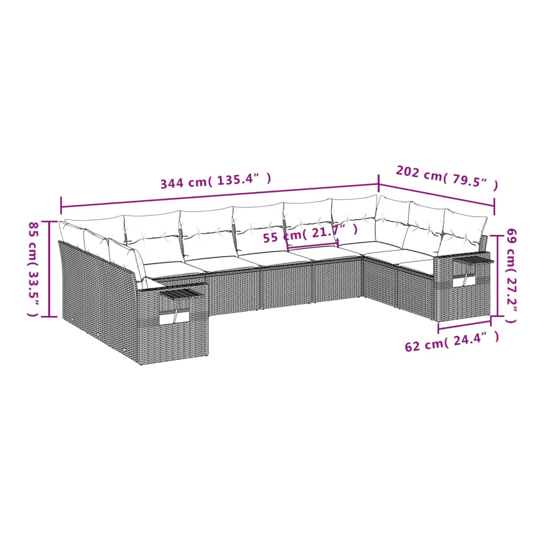 Cet ensemble de canapés de jardin est le complément parfait de votre arrière-cour, terrasse ou patio, offrant un espace confortable et accueillant pour discuter avec la famille et les amis ou simplement se détendre et profiter de l'extérieur. Matériau durable : la résine tressée, également connue sous le nom de poly rotin, est un matériau synthétique solide et nécessitant peu d'entretien qui ressemble au rotin naturel. Il est léger, facile à nettoyer et couramment utilisé pour les meubles d'extérieur en raison de sa durabilité et de ses propriétés de résistance aux intempéries.Fonction de rangement avec sac résistant à l'eau : le mobilier de jardin dispose d'un espace de rangement sous l'assise, complété par un sac résistant à l'eau pour ranger coussins, jouets et autres objets. Le sac intérieur peut être solidement fixé au mobilier d'extérieur grâce à des attaches auto-agrippantes pour plus de stabilité.Table d'appoint pratique : ce mobilier d'extérieur comprend une table d'appoint pliable avec un ressort à gaz sur les accoudoirs, offrant un endroit pratique pour garder vos essentiels à portée de main.Housse amovible et lavable : ces coussins de siège sont dotés de housses amovibles pour un lavage et un entretien faciles.Conception modulaire : cet ensemble de meubles d'extérieur a une conception modulaire, ce qui le rend complètement flexible et facile à déplacer, afin que vous puissiez créer un agencement de meubles d'extérieur personnalisé. Bon à savoir :Pour que vos meubles d'extérieur restent beaux, nous vous recommandons de les protéger avec une housse imperméable.