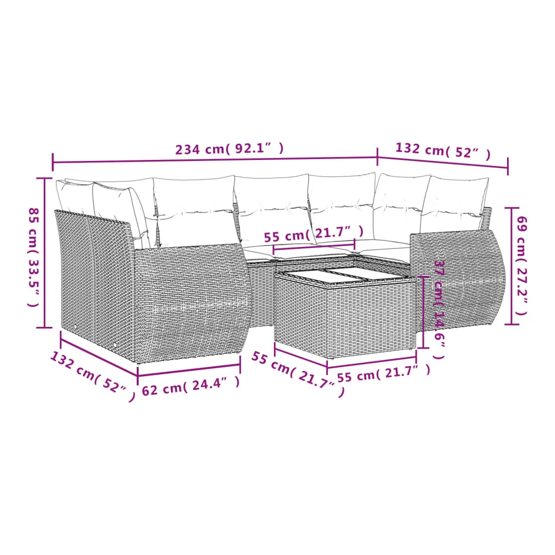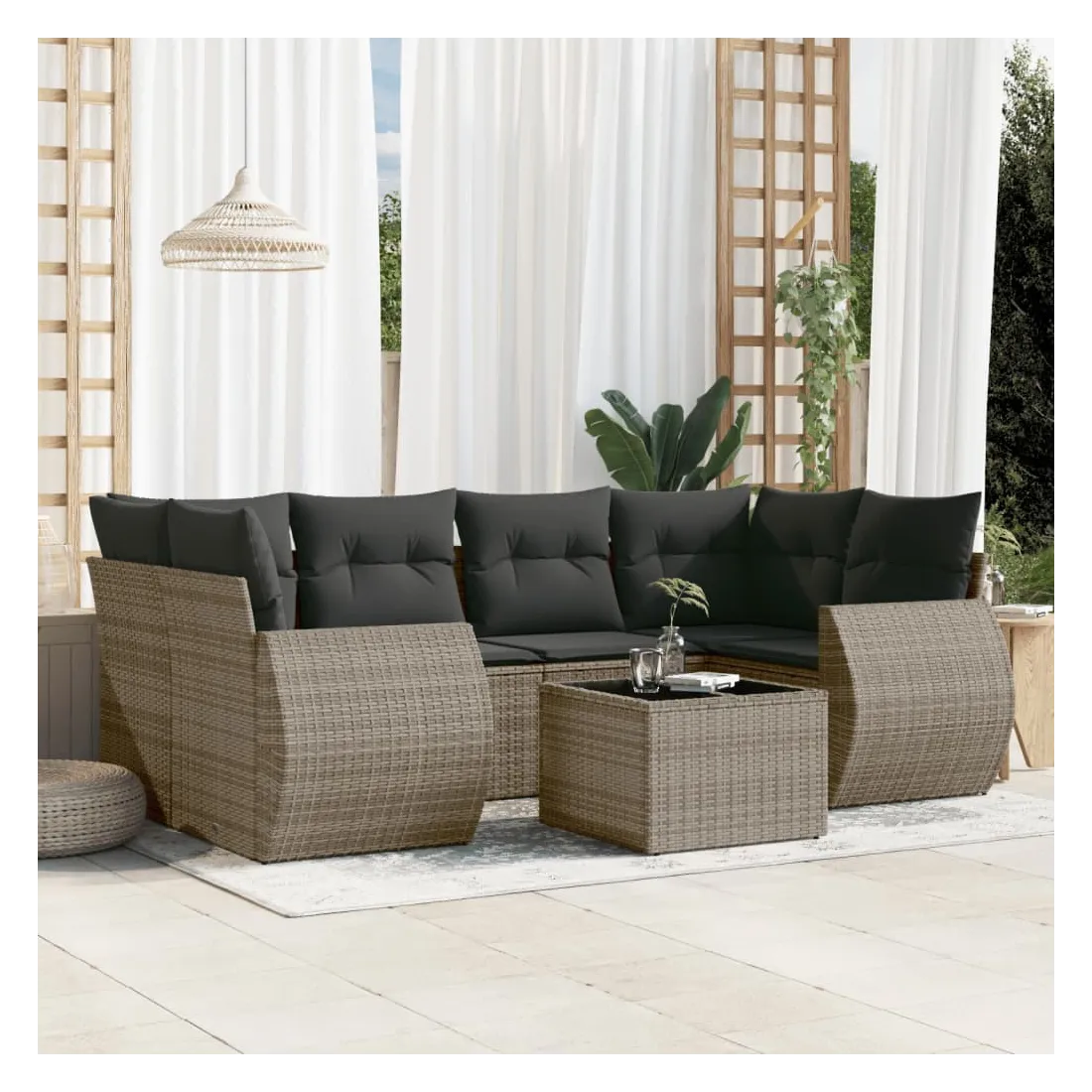 Cet ensemble de canapés de jardin est le complément parfait de votre arrière-cour, terrasse ou patio, offrant un espace confortable et accueillant pour discuter avec la famille et les amis ou simplement se détendre et profiter de l'extérieur. Matériau durable : la résine tressée, également connue sous le nom de poly rotin, est un matériau synthétique solide et nécessitant peu d'entretien qui ressemble au rotin naturel. Il est léger, facile à nettoyer et couramment utilisé pour les meubles d'extérieur en raison de sa durabilité et de ses propriétés de résistance aux intempéries.Fonction de rangement avec sac résistant à l'eau : chaque siège de jardin dispose d'un espace de rangement sous l'assise, complété par un sac résistant à l'eau pour ranger les coussins, les jouets et d'autres objets. Les sacs intérieurs sont dotés d'un couvercle et peuvent être solidement fixés aux sièges à l'aide de bandes auto-agrippantes pour plus de stabilité.Dessus en verre : le dessus de la table d'extérieur est fabriqué en verre trempé solide et durable, ce qui le rend facile à nettoyer avec un chiffon humide et ajoute une touche d'élégance à votre espace extérieur.Housse amovible et lavable : ces coussins de siège sont dotés de housses amovibles pour un lavage et un entretien faciles.Conception modulaire : cet ensemble de meubles d'extérieur a une conception modulaire, ce qui le rend complètement flexible et facile à déplacer, afin que vous puissiez créer un agencement de meubles d'extérieur personnalisé. Bon à savoir :Pour que vos meubles d'extérieur restent beaux, nous vous recommandons de les protéger avec une housse imperméable.