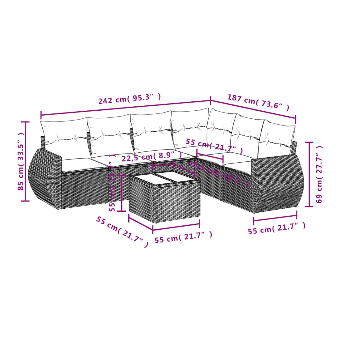 • Dimensions du coussin de siège : 55 x 55 x 3 cm (l x P x é)