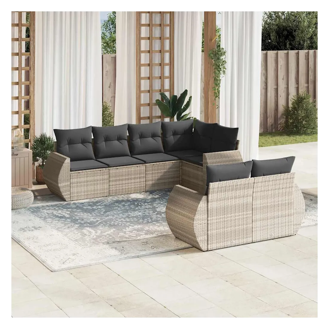 Cet ensemble de canapés de jardin est le complément parfait de votre arrière-cour, terrasse ou patio, offrant un espace confortable et accueillant pour discuter avec la famille et les amis ou simplement se détendre et profiter de l'extérieur. Matériau durable : la résine tressée, également connue sous le nom de poly rotin, est un matériau synthétique solide et nécessitant peu d'entretien qui ressemble au rotin naturel. Il est léger, facile à nettoyer et couramment utilisé pour les meubles d'extérieur en raison de sa durabilité et de ses propriétés de résistance aux intempéries.Fonction de rangement avec sac résistant à l'eau : chaque siège de jardin dispose d'un espace de rangement sous l'assise, complété par un sac résistant à l'eau pour ranger les coussins, les jouets et d'autres objets. Les sacs intérieurs sont dotés d'un couvercle et peuvent être solidement fixés aux sièges à l'aide de bandes auto-agrippantes pour plus de stabilité.Housse amovible et lavable : ces coussins de siège sont dotés de housses amovibles pour un lavage et un entretien faciles.Conception modulaire : cet ensemble de meubles d'extérieur a une conception modulaire, ce qui le rend complètement flexible et facile à déplacer, afin que vous puissiez créer un agencement de meubles d'extérieur personnalisé. Bon à savoir :Pour que vos meubles d'extérieur restent beaux, nous vous recommandons de les protéger avec une housse imperméable.