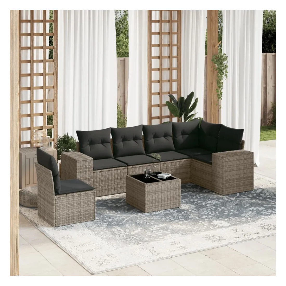 Cet ensemble de canapés de jardin est le complément parfait de votre arrière-cour, terrasse ou patio, offrant un espace confortable et accueillant pour discuter avec la famille et les amis ou simplement se détendre et profiter de l'extérieur. Matériau durable : la résine tressée, également connue sous le nom de poly rotin, est un matériau synthétique solide et nécessitant peu d'entretien qui ressemble au rotin naturel. Il est léger, facile à nettoyer et couramment utilisé pour les meubles d'extérieur en raison de sa durabilité et de ses propriétés de résistance aux intempéries.Fonction de rangement avec sac résistant à l'eau : le mobilier de jardin dispose d'un espace de rangement sous l'assise, complété par un sac résistant à l'eau pour ranger coussins, jouets et autres objets. Le sac intérieur peut être solidement fixé au mobilier d'extérieur grâce à des attaches auto-agrippantes pour plus de stabilité.Dessus en verre : le dessus de la table d'extérieur est fabriqué en verre trempé solide et durable, ce qui le rend facile à nettoyer avec un chiffon humide et ajoute une touche d'élégance à votre espace extérieur.Housse amovible et lavable : ces coussins de siège sont dotés de housses amovibles pour un lavage et un entretien faciles.Conception modulaire : cet ensemble de meubles d'extérieur a une conception modulaire, ce qui le rend complètement flexible et facile à déplacer, afin que vous puissiez créer un agencement de meubles d'extérieur personnalisé. Bon à savoir :Pour que vos meubles d'extérieur restent beaux, nous vous recommandons de les protéger avec une housse imperméable.