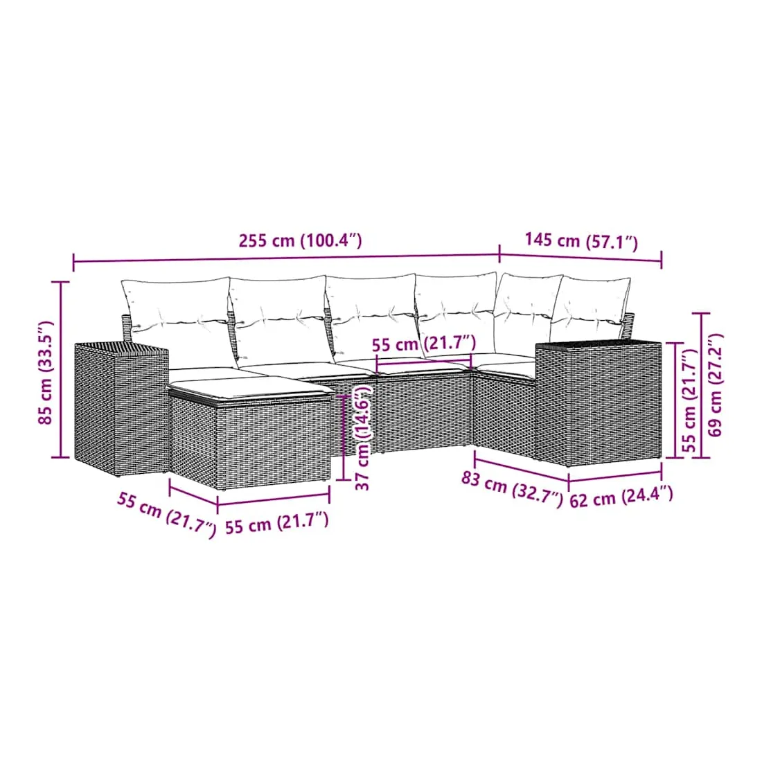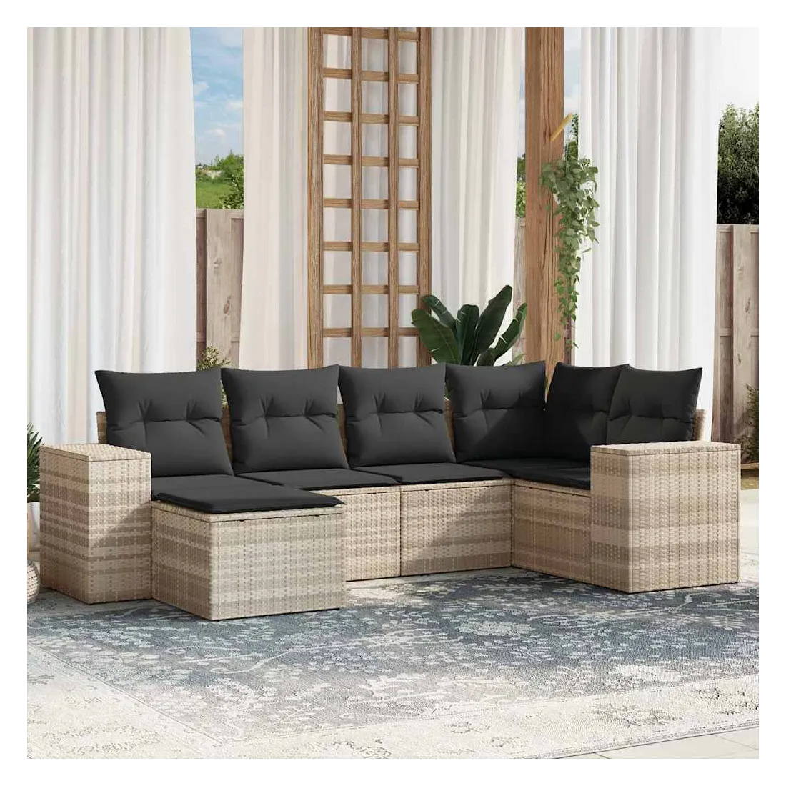 Cet ensemble de canapés de jardin est le complément parfait de votre arrière-cour, terrasse ou patio, offrant un espace confortable et accueillant pour discuter avec la famille et les amis ou simplement se détendre et profiter de l'extérieur. Matériau durable : la résine tressée, également connue sous le nom de poly rotin, est un matériau synthétique solide et nécessitant peu d'entretien qui ressemble au rotin naturel. Il est léger, facile à nettoyer et couramment utilisé pour les meubles d'extérieur en raison de sa durabilité et de ses propriétés de résistance aux intempéries.Fonction de rangement avec sac résistant à l'eau : le mobilier de jardin dispose d'un espace de rangement sous l'assise, complété par un sac résistant à l'eau pour ranger coussins, jouets et autres objets. Le sac intérieur peut être solidement fixé au mobilier d'extérieur grâce à des attaches auto-agrippantes pour plus de stabilité.Housse amovible et lavable : ces coussins de siège sont dotés de housses amovibles pour un lavage et un entretien faciles.Conception modulaire : cet ensemble de meubles d'extérieur a une conception modulaire, ce qui le rend complètement flexible et facile à déplacer, afin que vous puissiez créer un agencement de meubles d'extérieur personnalisé. Bon à savoir :Pour que vos meubles d'extérieur restent beaux, nous vous recommandons de les protéger avec une housse imperméable.