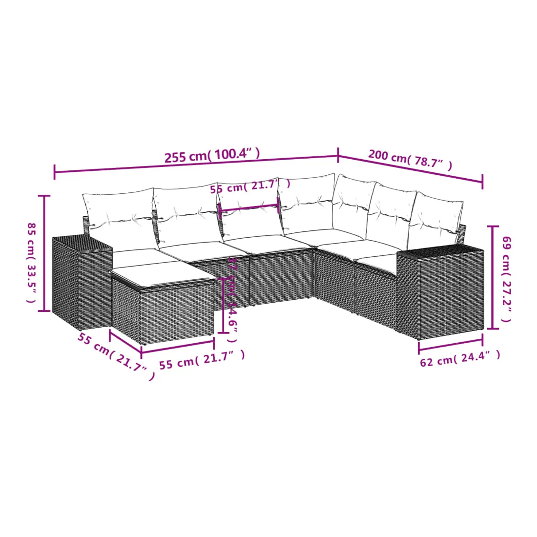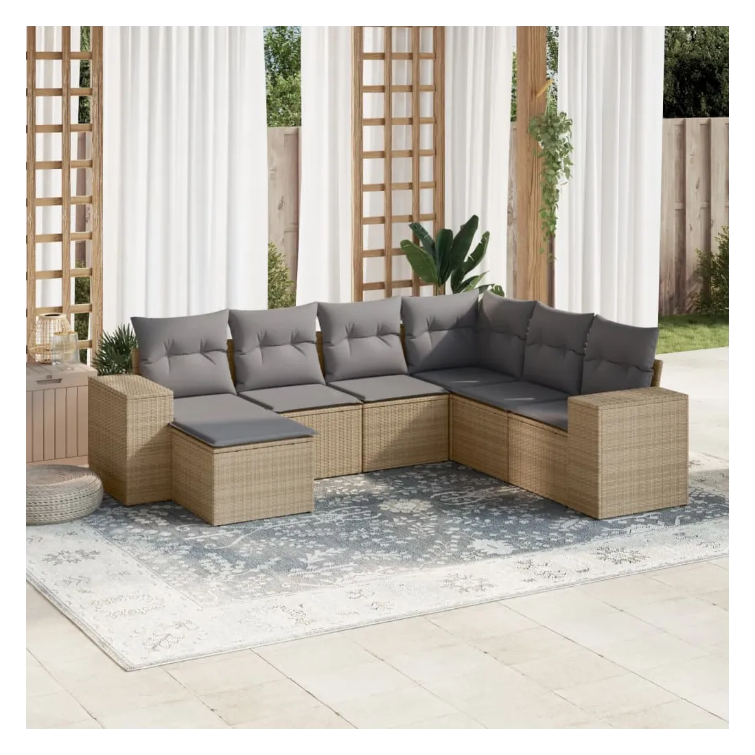 Cet ensemble de canapés de jardin est le complément parfait de votre arrière-cour, terrasse ou patio, offrant un espace confortable et accueillant pour discuter avec la famille et les amis ou simplement se détendre et profiter de l'extérieur. Matériau durable : la résine tressée, également connue sous le nom de poly rotin, est un matériau synthétique solide et nécessitant peu d'entretien qui ressemble au rotin naturel. Il est léger, facile à nettoyer et couramment utilisé pour les meubles d'extérieur en raison de sa durabilité et de ses propriétés de résistance aux intempéries.Fonction de rangement avec sac résistant à l'eau : le mobilier de jardin dispose d'un espace de rangement sous l'assise, complété par un sac résistant à l'eau pour ranger coussins, jouets et autres objets. Le sac intérieur peut être solidement fixé au mobilier d'extérieur grâce à des attaches auto-agrippantes pour plus de stabilité.Housse amovible et lavable : ces coussins de siège sont dotés de housses amovibles pour un lavage et un entretien faciles.Conception modulaire : cet ensemble de meubles d'extérieur a une conception modulaire, ce qui le rend complètement flexible et facile à déplacer, afin que vous puissiez créer un agencement de meubles d'extérieur personnalisé. Bon à savoir :Pour que vos meubles d'extérieur restent beaux, nous vous recommandons de les protéger avec une housse imperméable.