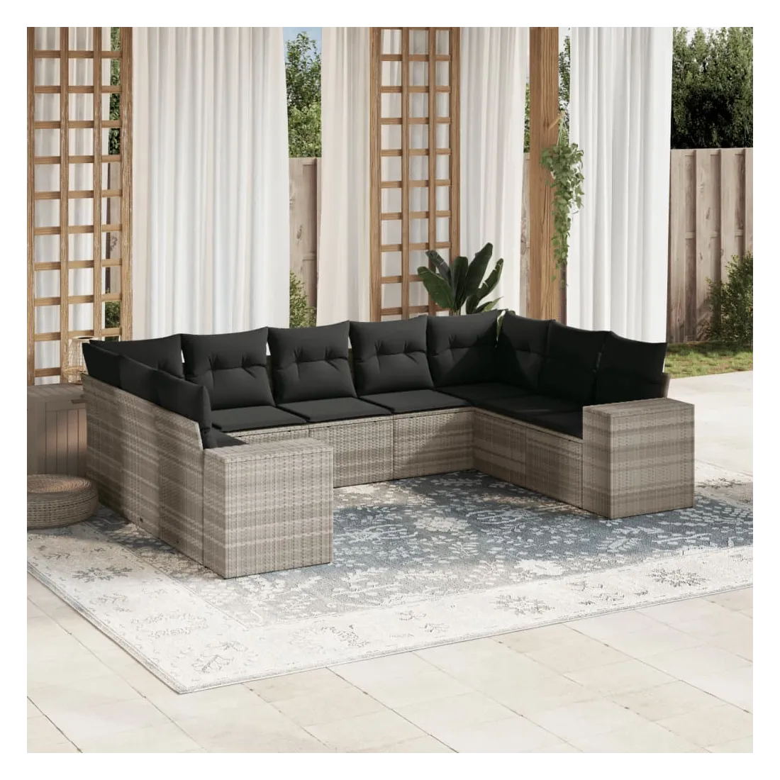 Cet ensemble de canapés de jardin est le complément parfait de votre arrière-cour, terrasse ou patio, offrant un espace confortable et accueillant pour discuter avec la famille et les amis ou simplement se détendre et profiter de l'extérieur. Matériau durable : la résine tressée, également connue sous le nom de poly rotin, est un matériau synthétique solide et nécessitant peu d'entretien qui ressemble au rotin naturel. Il est léger, facile à nettoyer et couramment utilisé pour les meubles d'extérieur en raison de sa durabilité et de ses propriétés de résistance aux intempéries.Fonction de rangement avec sac résistant à l'eau : le mobilier de jardin dispose d'un espace de rangement sous l'assise, complété par un sac résistant à l'eau pour ranger coussins, jouets et autres objets. Le sac intérieur peut être solidement fixé au mobilier d'extérieur grâce à des attaches auto-agrippantes pour plus de stabilité.Housse amovible et lavable : ces coussins de siège sont dotés de housses amovibles pour un lavage et un entretien faciles.Conception modulaire : cet ensemble de meubles d'extérieur a une conception modulaire, ce qui le rend complètement flexible et facile à déplacer, afin que vous puissiez créer un agencement de meubles d'extérieur personnalisé. Bon à savoir :Pour que vos meubles d'extérieur restent beaux, nous vous recommandons de les protéger avec une housse imperméable.