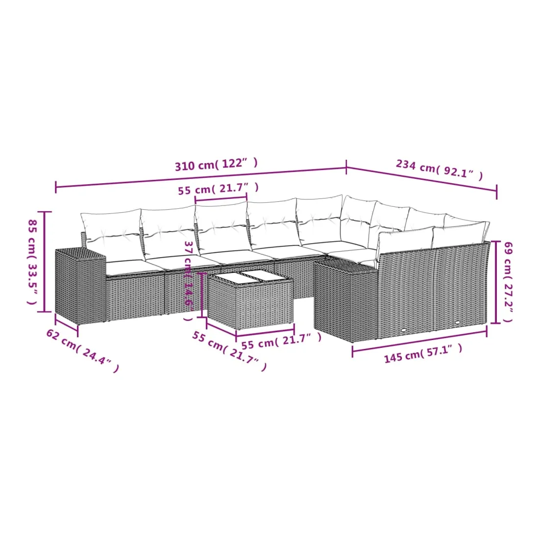 • 9 x coussin d'assise avec housse amovible et lavable