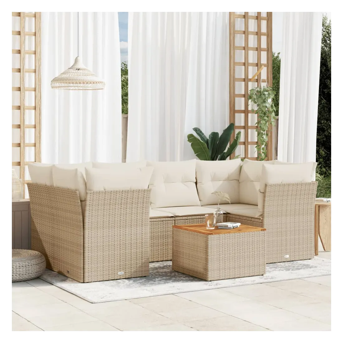 Cet ensemble de canapés de jardin est le complément parfait de votre arrière-cour, terrasse ou patio, offrant un espace confortable et accueillant pour discuter avec la famille et les amis ou simplement se détendre et profiter de l'extérieur. Matériau durable : la résine tressée, également connue sous le nom de poly rotin, est un matériau synthétique solide et nécessitant peu d'entretien qui ressemble au rotin naturel. Il est léger, facile à nettoyer et couramment utilisé pour les meubles d'extérieur en raison de sa durabilité et de ses propriétés de résistance aux intempéries.Fonction de rangement avec sac résistant à l'eau : chaque siège de jardin dispose d'un espace de rangement sous l'assise, complété par un sac résistant à l'eau pour ranger les coussins, les jouets et d'autres objets. Les sacs intérieurs sont dotés d'un couvercle et peuvent être solidement fixés aux sièges à l'aide de bandes auto-agrippantes pour plus de stabilité.Dessus stable et facile à nettoyer : cette table de jardin a un dessus en bois d'acacia robuste, durable et facile à nettoyer avec un chiffon humide.Housse amovible et lavable : ces coussins de siège sont dotés de housses amovibles pour un lavage et un entretien faciles.Conception modulaire : cet ensemble de meubles d'extérieur a une conception modulaire, ce qui le rend complètement flexible et facile à déplacer, afin que vous puissiez créer un agencement de meubles d'extérieur personnalisé. Bon à savoir :Pour que vos meubles d'extérieur restent beaux, nous vous recommandons de les protéger avec une housse imperméable.