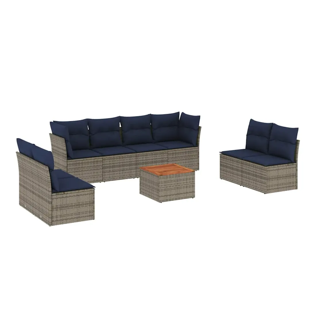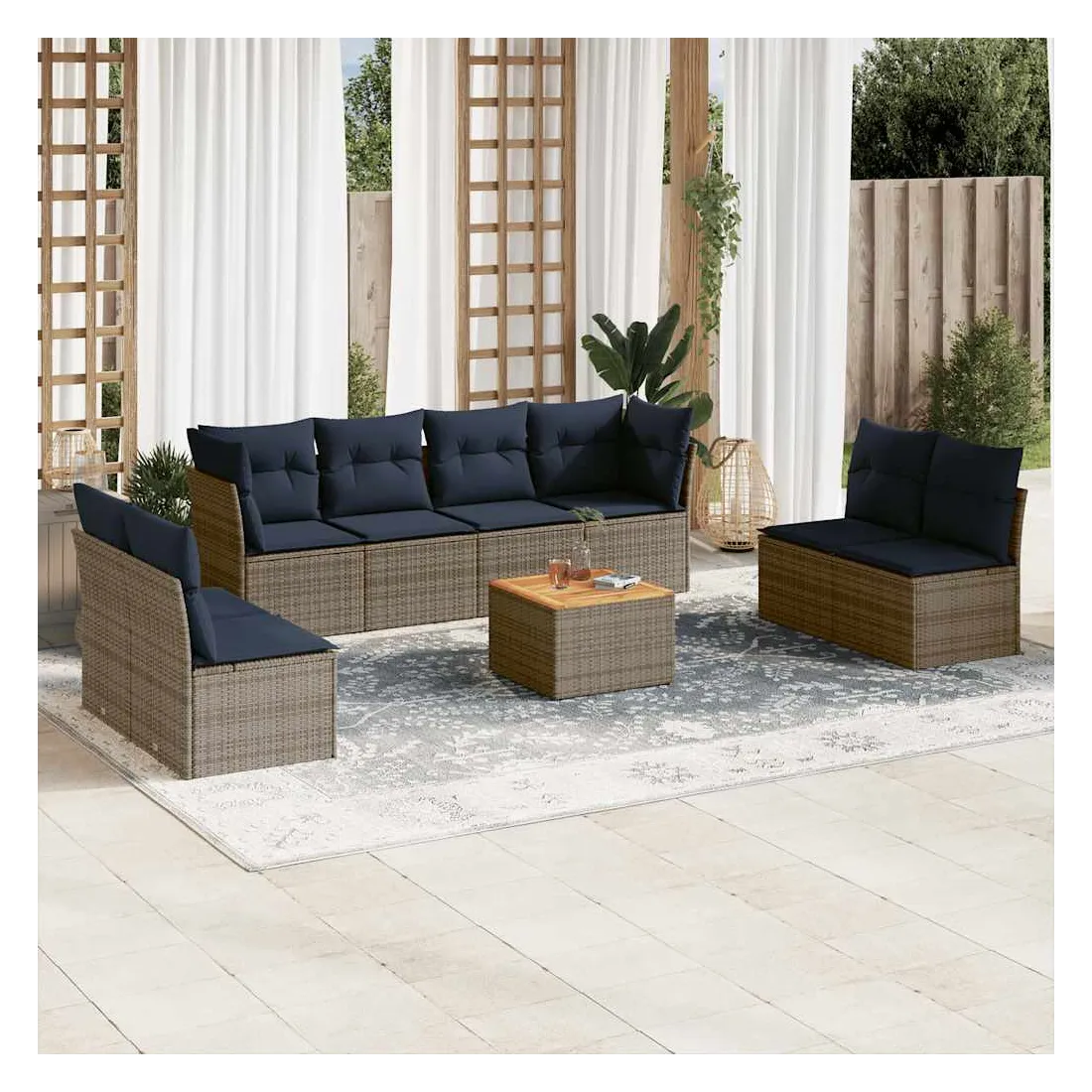 Cet ensemble de canapés de jardin est le complément parfait de votre arrière-cour, terrasse ou patio, offrant un espace confortable et accueillant pour discuter avec la famille et les amis ou simplement se détendre et profiter de l'extérieur. Matériau durable : la résine tressée, également connue sous le nom de poly rotin, est un matériau synthétique solide et nécessitant peu d'entretien qui ressemble au rotin naturel. Il est léger, facile à nettoyer et couramment utilisé pour les meubles d'extérieur en raison de sa durabilité et de ses propriétés de résistance aux intempéries.Fonction de rangement avec sac résistant à l'eau : chaque siège de jardin dispose d'un espace de rangement sous l'assise, complété par un sac résistant à l'eau pour ranger les coussins, les jouets et d'autres objets. Les sacs intérieurs sont dotés d'un couvercle et peuvent être solidement fixés aux sièges à l'aide de bandes auto-agrippantes pour plus de stabilité.Dessus stable et facile à nettoyer : cette table de jardin a un dessus en bois d'acacia robuste, durable et facile à nettoyer avec un chiffon humide.Housse amovible et lavable : ces coussins de siège sont dotés de housses amovibles pour un lavage et un entretien faciles.Conception modulaire : cet ensemble de meubles d'extérieur a une conception modulaire, ce qui le rend complètement flexible et facile à déplacer, afin que vous puissiez créer un agencement de meubles d'extérieur personnalisé. Bon à savoir :Pour que vos meubles d'extérieur restent beaux, nous vous recommandons de les protéger avec une housse imperméable.