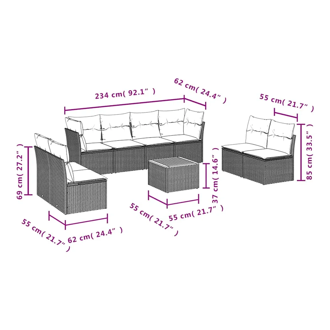 - 8 x coussin d'assise avec housse amovible et lavable