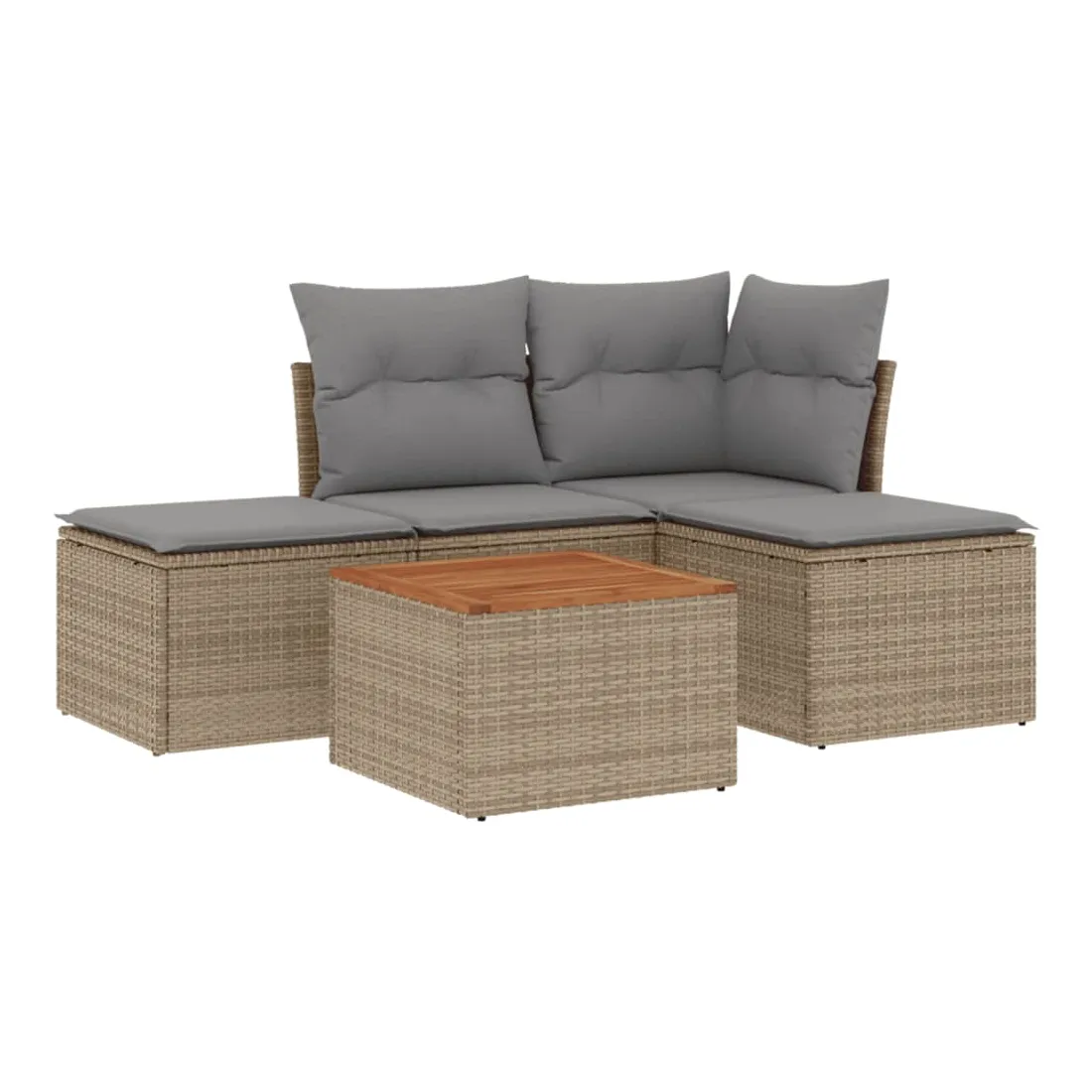 Cet ensemble de canapés de jardin est le complément parfait de votre arrière-cour, terrasse ou patio, offrant un espace confortable et accueillant pour discuter avec la famille et les amis ou simplement se détendre et profiter de l'extérieur. Matériau durable : la résine tressée, également connue sous le nom de poly rotin, est un matériau synthétique solide et nécessitant peu d'entretien qui ressemble au rotin naturel. Il est léger, facile à nettoyer et couramment utilisé pour les meubles d'extérieur en raison de sa durabilité et de ses propriétés de résistance aux intempéries.Fonction de rangement avec sac résistant à l'eau : chaque siège de jardin dispose d'un espace de rangement sous l'assise, complété par un sac résistant à l'eau pour ranger les coussins, les jouets et d'autres objets. Les sacs intérieurs sont dotés d'un couvercle et peuvent être solidement fixés aux sièges à l'aide de bandes auto-agrippantes pour plus de stabilité.Dessus stable et facile à nettoyer : cette table de jardin a un dessus en bois d'acacia robuste, durable et facile à nettoyer avec un chiffon humide.Pouf polyvalent : le tabouret est polyvalent, servant de repose-pieds confortable lorsque vous vous prélassez sur le canapé ou de siège supplémentaire dans votre jardin.Conception modulaire : cet ensemble de meubles d'extérieur a une conception modulaire, ce qui le rend complètement flexible et facile à déplacer, afin que vous puissiez créer un agencement de meubles d'extérieur personnalisé. Bon à savoir :Pour que vos meubles d'extérieur restent beaux, nous vous recommandons de les protéger avec une housse imperméable.