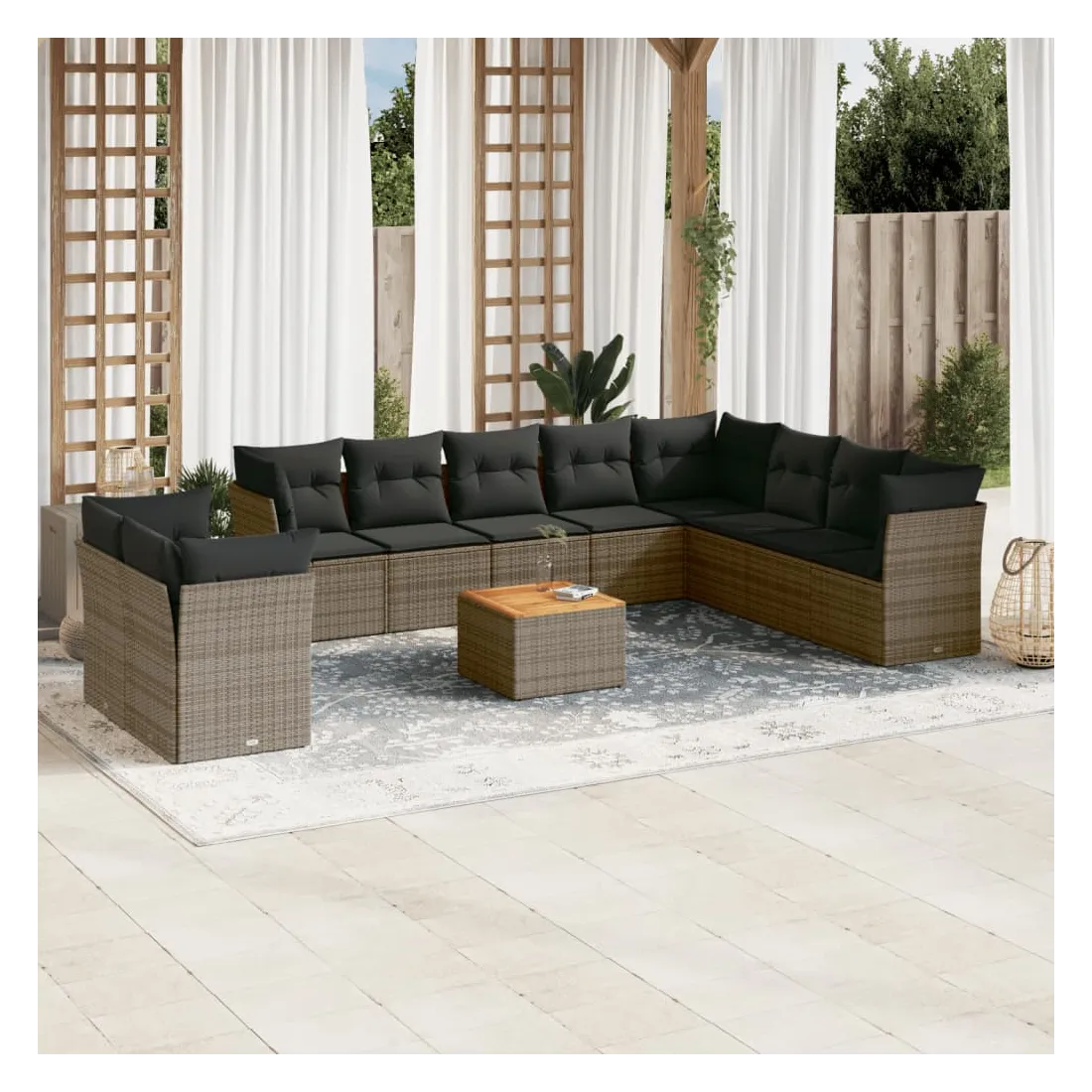 Cet ensemble de canapés de jardin est le complément parfait de votre arrière-cour, terrasse ou patio, offrant un espace confortable et accueillant pour discuter avec la famille et les amis ou simplement se détendre et profiter de l'extérieur. Matériau durable : la résine tressée, également connue sous le nom de poly rotin, est un matériau synthétique solide et nécessitant peu d'entretien qui ressemble au rotin naturel. Il est léger, facile à nettoyer et couramment utilisé pour les meubles d'extérieur en raison de sa durabilité et de ses propriétés de résistance aux intempéries.Fonction de rangement avec sac résistant à l'eau : chaque siège de jardin dispose d'un espace de rangement sous l'assise, complété par un sac résistant à l'eau pour ranger les coussins, les jouets et d'autres objets. Les sacs intérieurs sont dotés d'un couvercle et peuvent être solidement fixés aux sièges à l'aide de bandes auto-agrippantes pour plus de stabilité.Dessus stable et facile à nettoyer : cette table de jardin a un dessus en bois d'acacia robuste, durable et facile à nettoyer avec un chiffon humide.Housse amovible et lavable : ces coussins de siège sont dotés de housses amovibles pour un lavage et un entretien faciles.Conception modulaire : cet ensemble de meubles d'extérieur a une conception modulaire, ce qui le rend complètement flexible et facile à déplacer, afin que vous puissiez créer un agencement de meubles d'extérieur personnalisé. Bon à savoir :Pour que vos meubles d'extérieur restent beaux, nous vous recommandons de les protéger avec une housse imperméable.