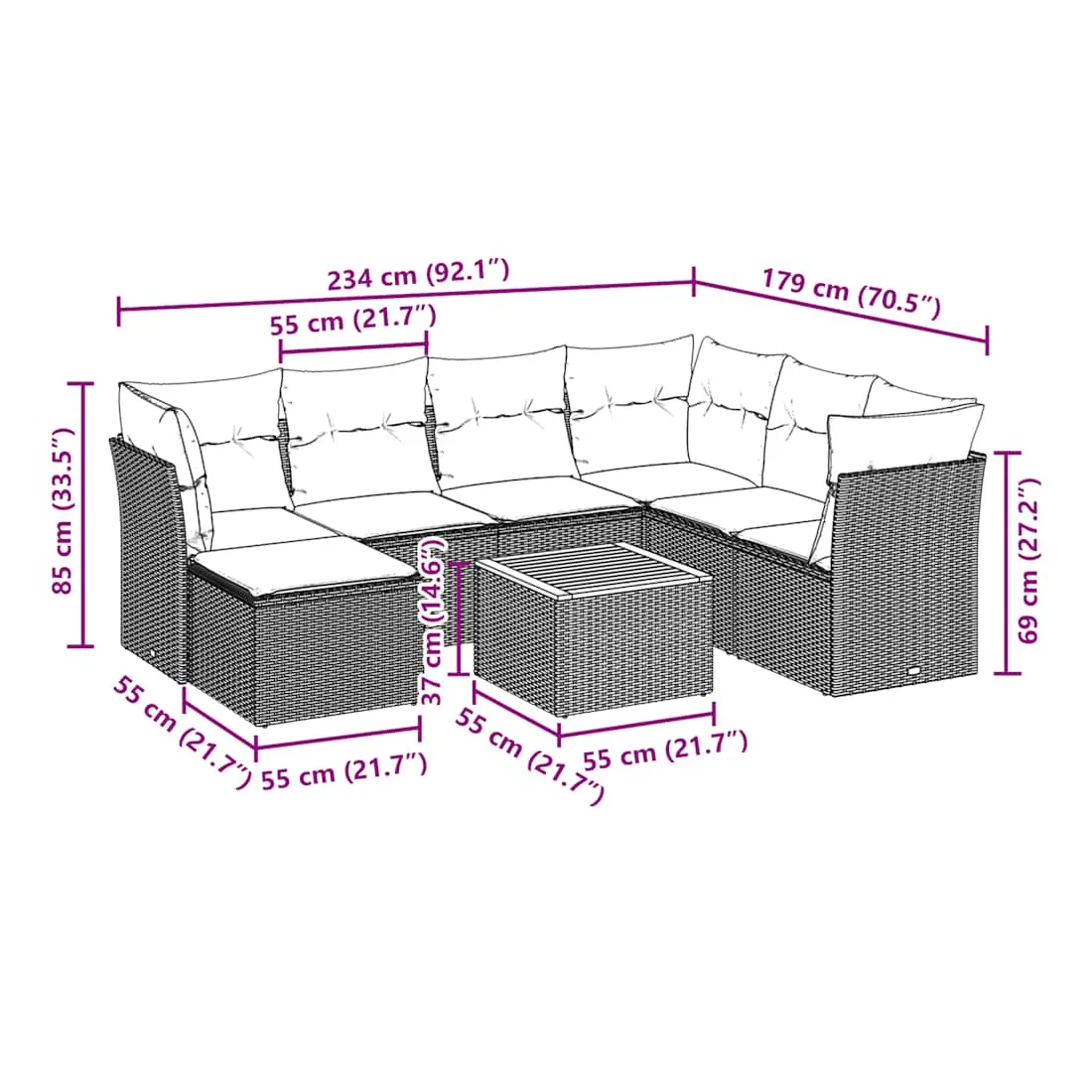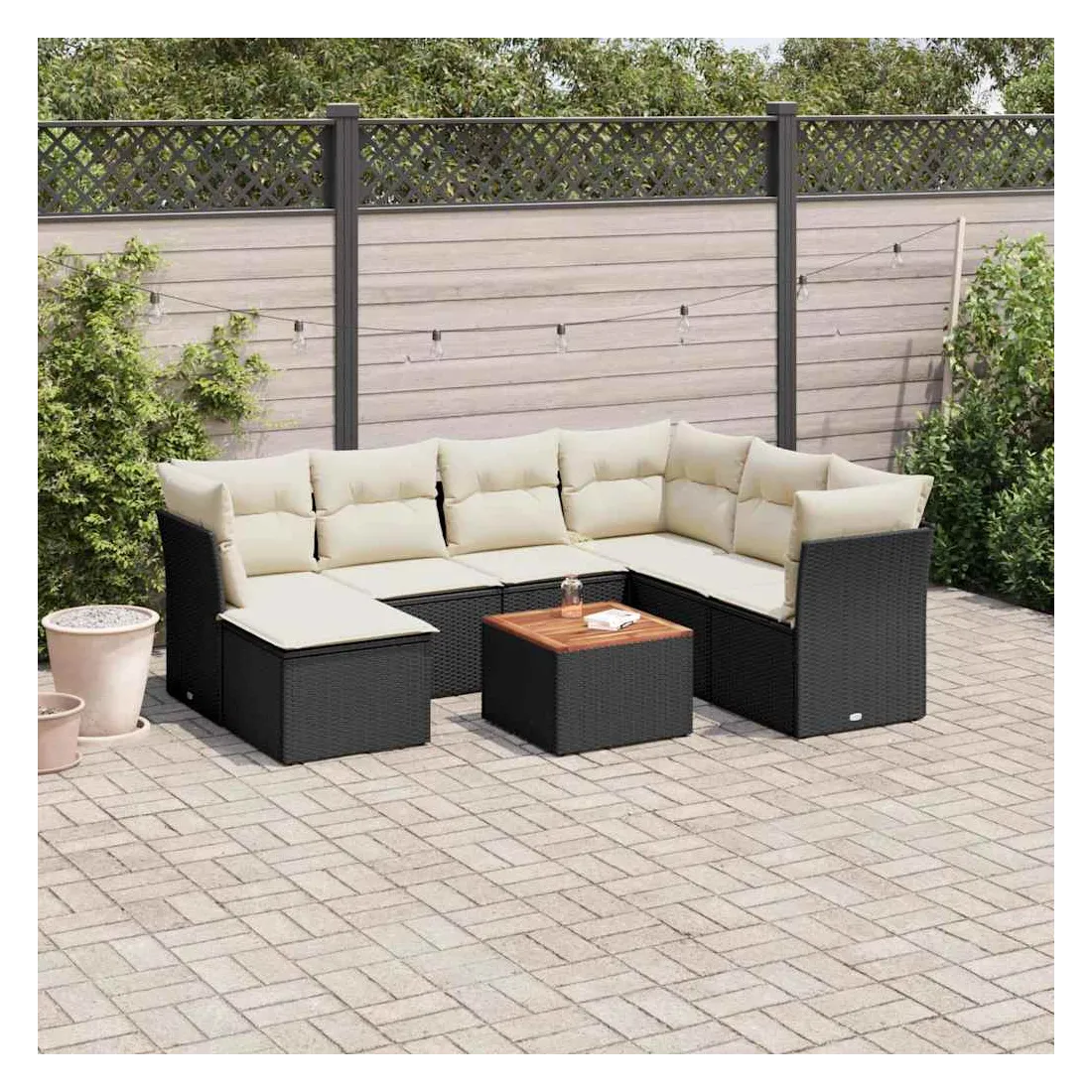Cet ensemble de canapés de jardin est le complément parfait de votre arrière-cour, terrasse ou patio, offrant un espace confortable et accueillant pour discuter avec la famille et les amis ou simplement se détendre et profiter de l'extérieur. Matériau durable : la résine tressée, également connue sous le nom de poly rotin, est un matériau synthétique solide et nécessitant peu d'entretien qui ressemble au rotin naturel. Il est léger, facile à nettoyer et couramment utilisé pour les meubles d'extérieur en raison de sa durabilité et de ses propriétés de résistance aux intempéries.Fonction de rangement avec sac résistant à l'eau : chaque siège de jardin dispose d'un espace de rangement sous l'assise, complété par un sac résistant à l'eau pour ranger les coussins, les jouets et d'autres objets. Les sacs intérieurs sont dotés d'un couvercle et peuvent être solidement fixés aux sièges à l'aide de bandes auto-agrippantes pour plus de stabilité.Dessus stable et facile à nettoyer : cette table de jardin a un dessus en bois d'acacia robuste, durable et facile à nettoyer avec un chiffon humide.Pouf polyvalent : le tabouret est polyvalent, servant de repose-pieds confortable lorsque vous vous prélassez sur le canapé ou de siège supplémentaire dans votre jardin.Conception modulaire : cet ensemble de meubles d'extérieur a une conception modulaire, ce qui le rend complètement flexible et facile à déplacer, afin que vous puissiez créer un agencement de meubles d'extérieur personnalisé. Bon à savoir :Pour que vos meubles d'extérieur restent beaux, nous vous recommandons de les protéger avec une housse imperméable.