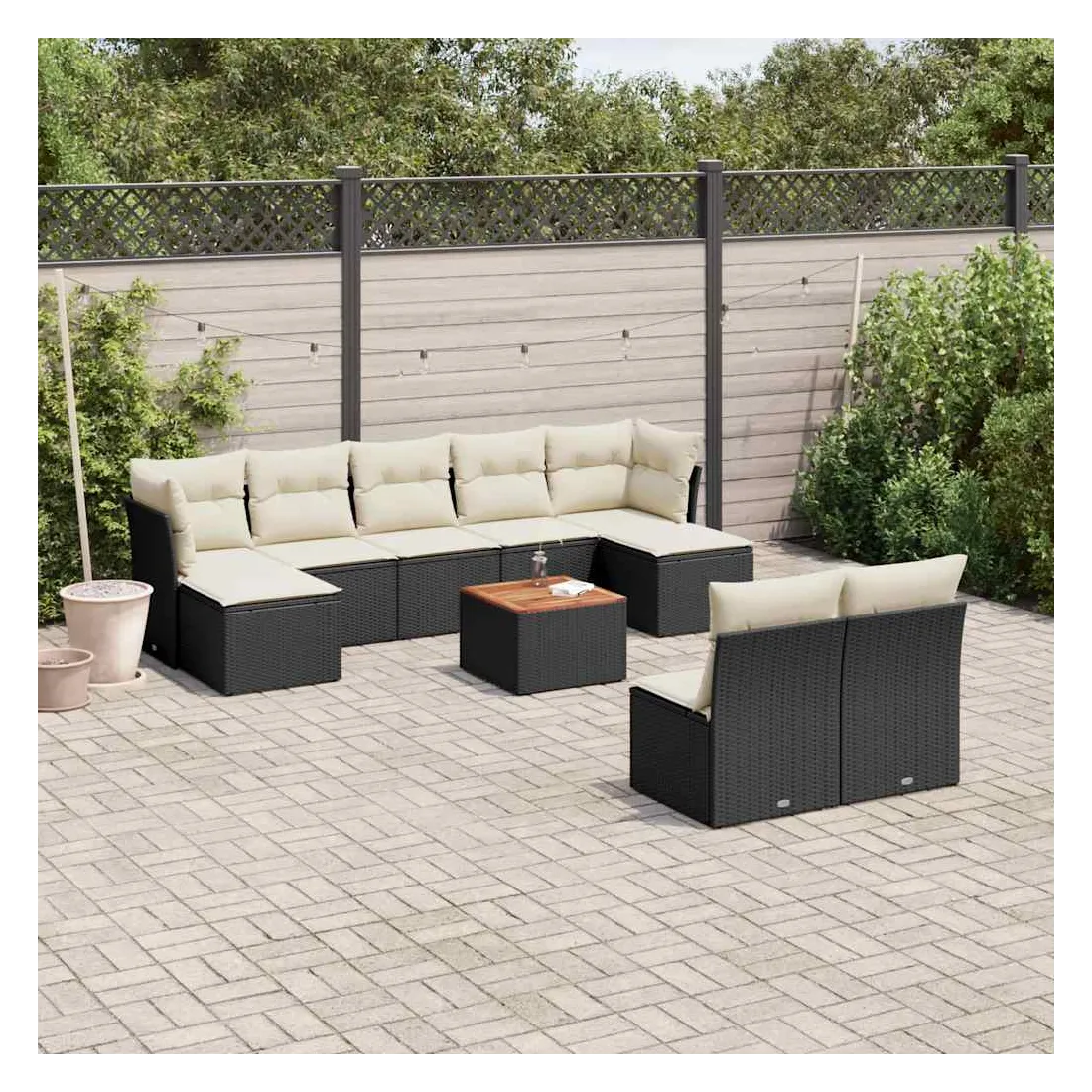 Cet ensemble de canapés de jardin est le complément parfait de votre arrière-cour, terrasse ou patio, offrant un espace confortable et accueillant pour discuter avec la famille et les amis ou simplement se détendre et profiter de l'extérieur. Matériau durable : la résine tressée, également connue sous le nom de poly rotin, est un matériau synthétique solide et nécessitant peu d'entretien qui ressemble au rotin naturel. Il est léger, facile à nettoyer et couramment utilisé pour les meubles d'extérieur en raison de sa durabilité et de ses propriétés de résistance aux intempéries.Fonction de rangement avec sac résistant à l'eau : chaque siège de jardin dispose d'un espace de rangement sous l'assise, complété par un sac résistant à l'eau pour ranger les coussins, les jouets et d'autres objets. Les sacs intérieurs sont dotés d'un couvercle et peuvent être solidement fixés aux sièges à l'aide de bandes auto-agrippantes pour plus de stabilité.Dessus stable et facile à nettoyer : cette table de jardin a un dessus en bois d'acacia robuste, durable et facile à nettoyer avec un chiffon humide.Pouf polyvalent : le tabouret est polyvalent, servant de repose-pieds confortable lorsque vous vous prélassez sur le canapé ou de siège supplémentaire dans votre jardin.Conception modulaire : cet ensemble de meubles d'extérieur a une conception modulaire, ce qui le rend complètement flexible et facile à déplacer, afin que vous puissiez créer un agencement de meubles d'extérieur personnalisé. Bon à savoir :Pour que vos meubles d'extérieur restent beaux, nous vous recommandons de les protéger avec une housse imperméable.