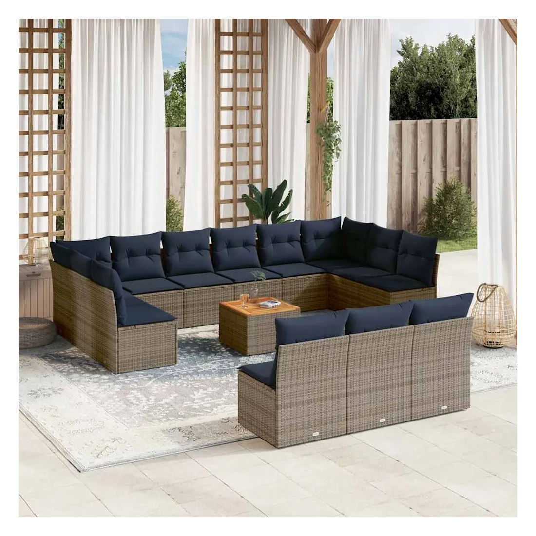 Cet ensemble de canapés de jardin est le complément parfait de votre arrière-cour, terrasse ou patio, offrant un espace confortable et accueillant pour discuter avec la famille et les amis ou simplement se détendre et profiter de l'extérieur. Matériau durable : la résine tressée, également connue sous le nom de poly rotin, est un matériau synthétique solide et nécessitant peu d'entretien qui ressemble au rotin naturel. Il est léger, facile à nettoyer et couramment utilisé pour les meubles d'extérieur en raison de sa durabilité et de ses propriétés de résistance aux intempéries.Fonction de rangement avec sac résistant à l'eau : chaque siège de jardin dispose d'un espace de rangement sous l'assise, complété par un sac résistant à l'eau pour ranger les coussins, les jouets et d'autres objets. Les sacs intérieurs sont dotés d'un couvercle et peuvent être solidement fixés aux sièges à l'aide de bandes auto-agrippantes pour plus de stabilité.Dessus stable et facile à nettoyer : cette table de jardin a un dessus en bois d'acacia robuste, durable et facile à nettoyer avec un chiffon humide.Housse amovible et lavable : ces coussins de siège sont dotés de housses amovibles pour un lavage et un entretien faciles.Conception modulaire : cet ensemble de meubles d'extérieur a une conception modulaire, ce qui le rend complètement flexible et facile à déplacer, afin que vous puissiez créer un agencement de meubles d'extérieur personnalisé. Bon à savoir :Pour que vos meubles d'extérieur restent beaux, nous vous recommandons de les protéger avec une housse imperméable.